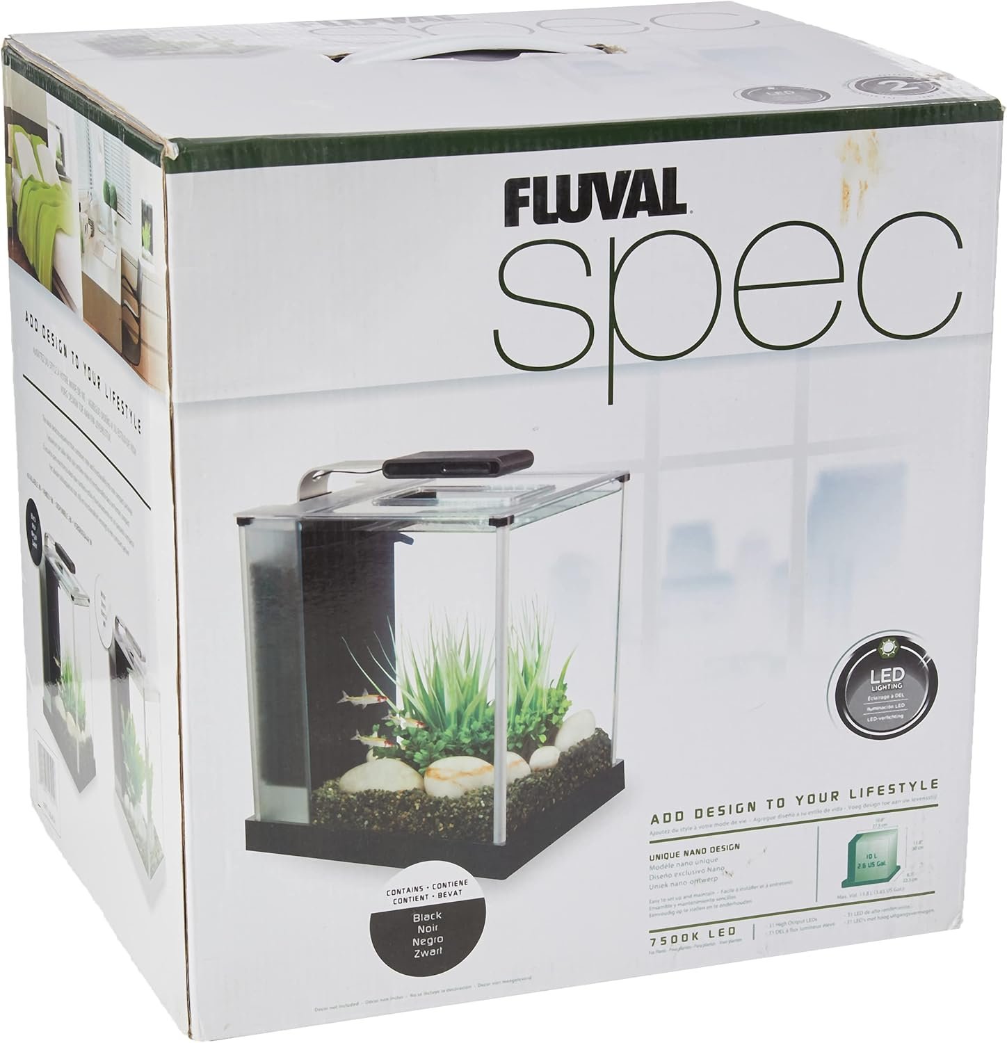 Fluval SPEC is a contemporary looking aquarium designed for small areas such as desktops and countertops. This 2.6-gallon etched glass aquarium with aluminum trim combines style and functionality in one small package. Though small in stature, Fluval SPEC is big on features. It comes with a sleekly designed overhanging LED lighting system, consisting of 31 powerful LED lamps, that arches above the aquarium to provide brilliant illumination for plants and décor. The aquarium includes a powerful circulation pump with adjustable output nozzle and a large 3-stage filtration system that provides more than enough filtration for ultra clean and clear water. It also comes with all the necessary filter media for effective and thorough mechanical, chemical and biological filtration: a porous foam block with convenient handle traps large particles and debris, activated carbon adsorbs unwanted odors, discolorations and impurities and BioMax insert provides optimal colonization of beneficial bacteria and enhances the nitrification of fish wastes. The pump and filtration system are conveniently located in a separate chamber at one end of the aquarium to simplify maintenance. To ensure the well-being of aquarium inhabitants, it is essential to maintain your aquarium. At the very minimum, remove 20% of the water once a week and replace with tap water that is of similar temperature to your tank and treated with the correct dose of Nutrafin Aqua Plus. Regular replacement of Fluval filter media is essential to ensure optimum performance. The filter media should be changed alternately in order to maintain continuous biological activity. To enhance bacterial action, pour a dose of Nutrafin Cycle onto your filter inserts each time you change the media.