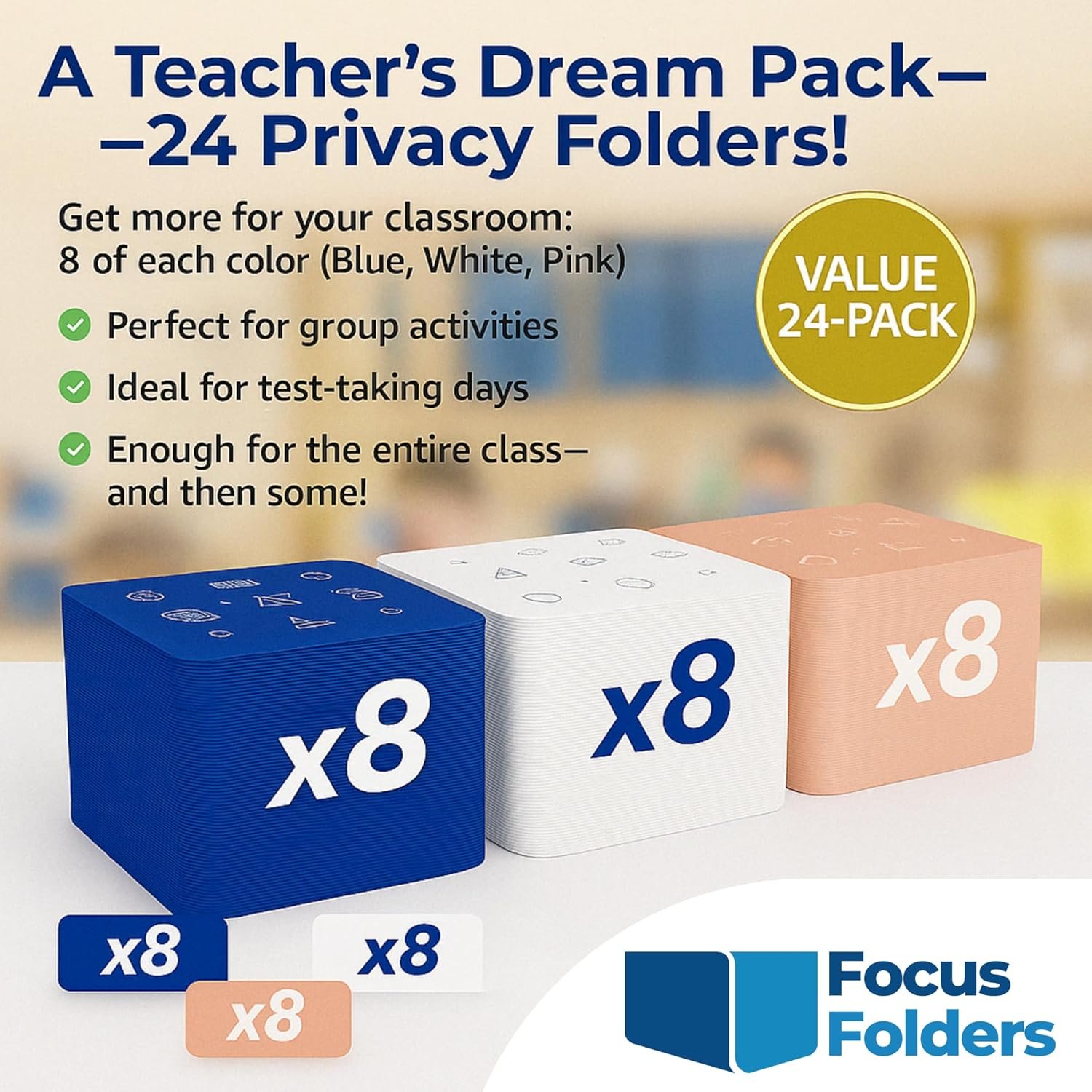 ✓ Ultimate Classroom Bundle – With 24 Privacy Folders per pack, teachers get plenty to cover their whole class—and then some! Plus, the free storage box with a handy carrying handle makes organizing and transporting a snap. Ideal for kindergarten and elementary classrooms, this set of Test Dividers for Student Desks delivers unbeatable value and convenience, giving you more folders for less when compared to other brands!