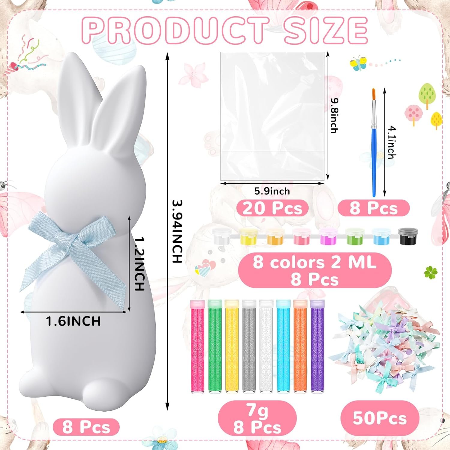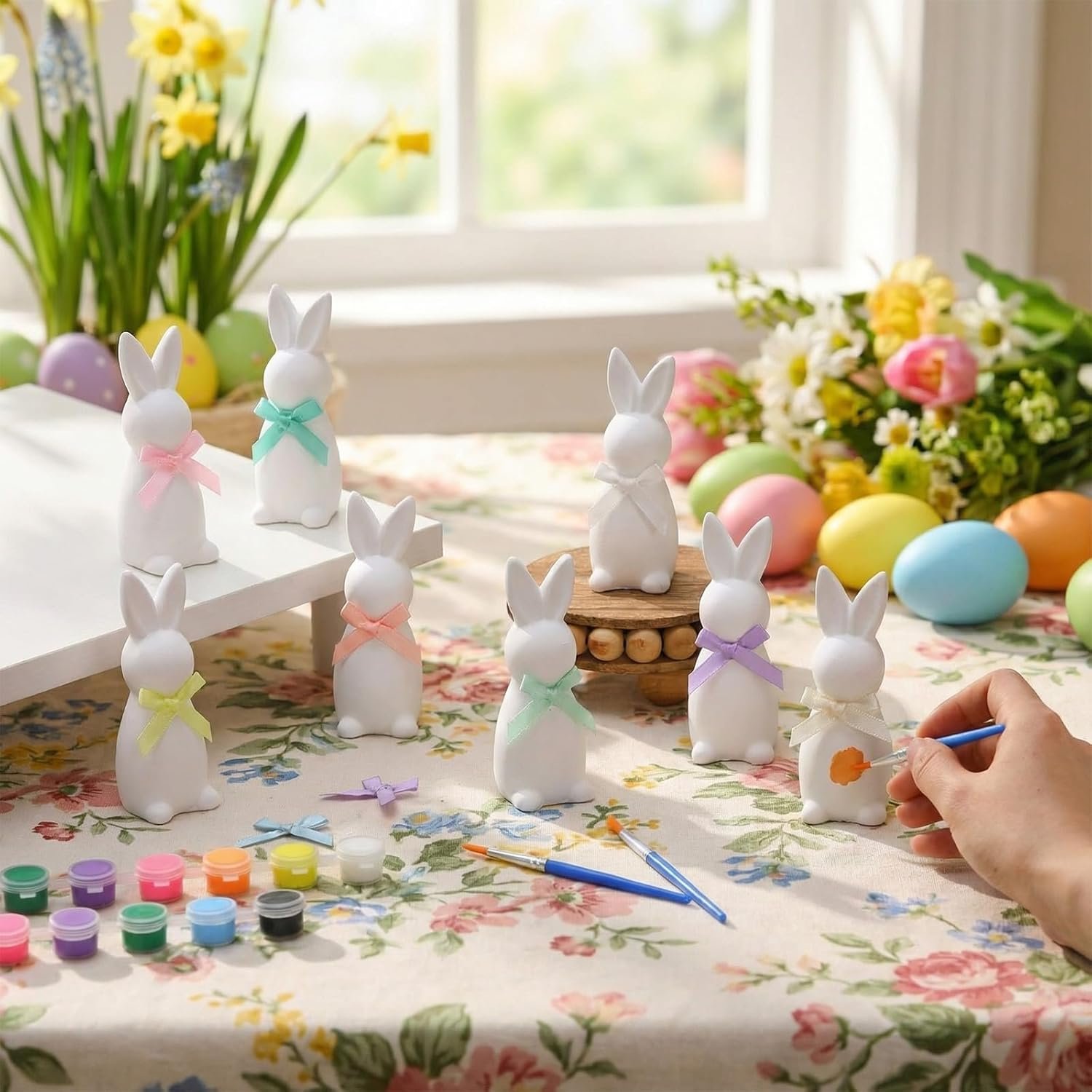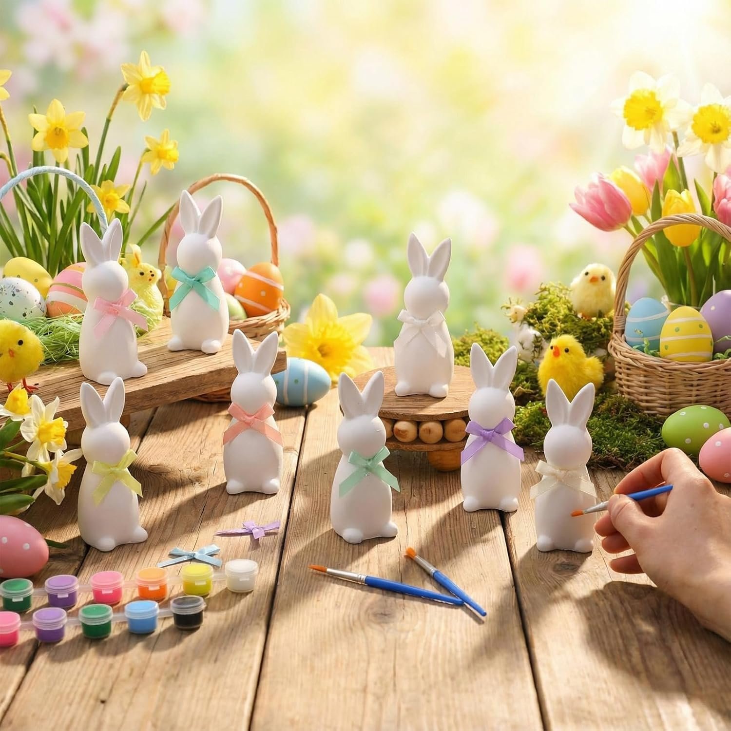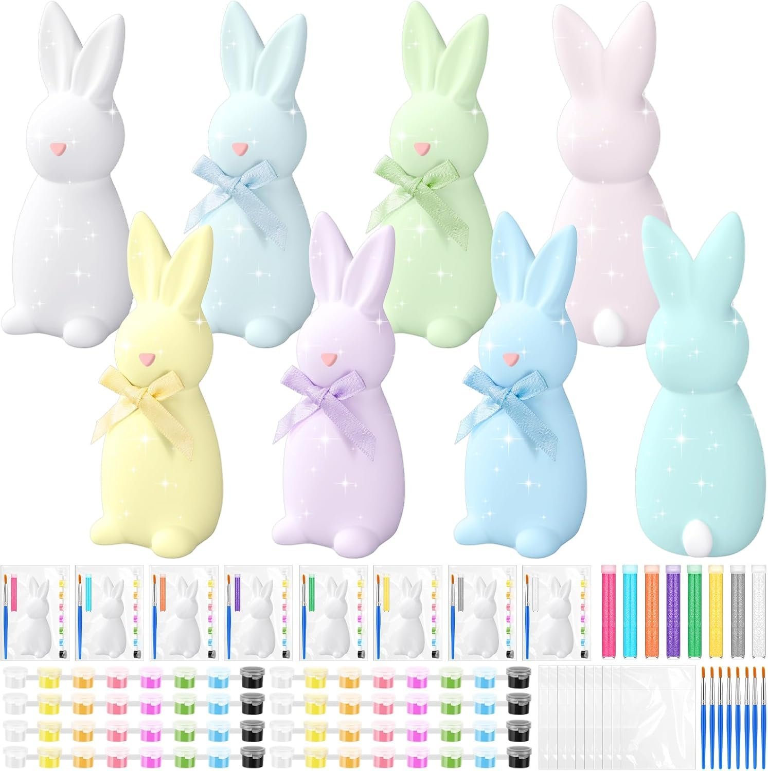 DIY Easter Bunny Painting Kit: the ceramic bunny painting kits with bow include 8 unpainted Easter bunny ceramic figurines, brush and acrylic paint, opp bag, immerse yourself in the fun of creative activities with DIY unpainted ceramic Easter bunny figurines kit, making it easy to create delightful, festive decorations that embody the holiday cheer