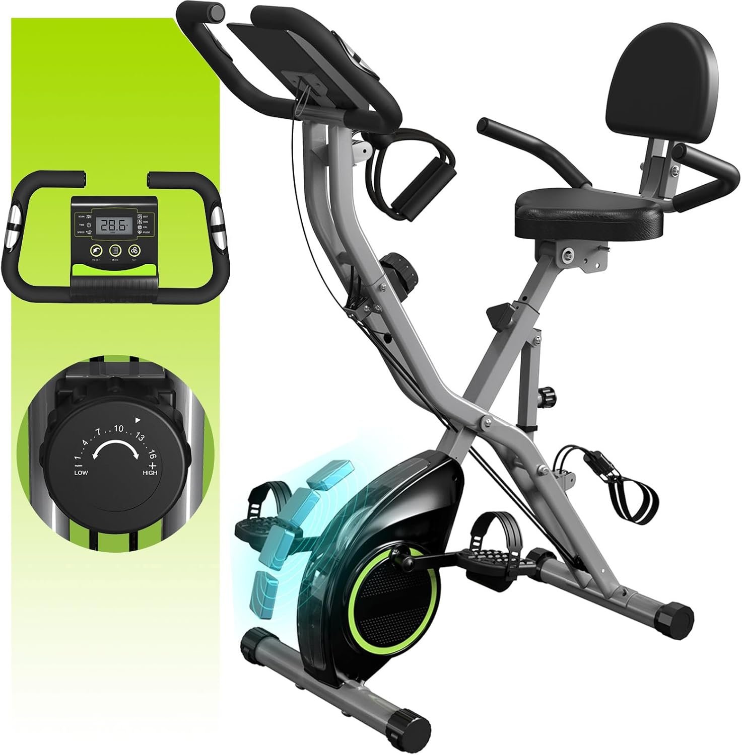 IMPORTANT DETAILS: (1) This workout bike is suitable for riders ranging from 4’11” to 6’6″ tall, accommodating a max weight of 300 pounds. (2) The cycling bike folds completely for compact storage, and comes with wheels for seamless transportation. (3) Boasting an LCD display, the folding bike keeps track of key stats like time, speed, and calories burned. Plus, it includes a handy phone holder for entertainment while you work out.