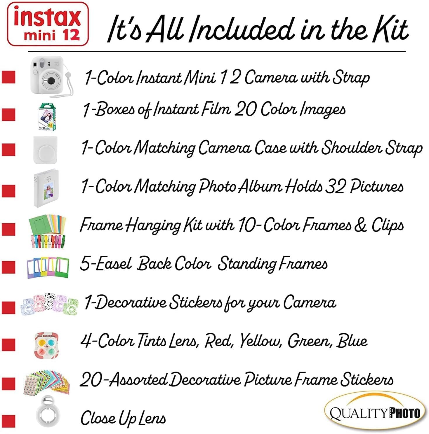 Value accessory bundle. Includes the famous Fujifilm Instax Mini 12 Camera (color your choice) with a matching Camera Case to keep the camera protected. 20 Fujifilm Instax Films so you can use your brand new camera right away! Photo Album, perfectly sized for the instant prints. Many more accessories including frames to hang and decorate you photos, stickers, close up color lenses, and camera sticker for added color. The newly updated Fujifilm instax Mini Camera 12 features a slim body with newest design. Parties, birthdays anniversaries, carnivals or gifts… all are times to use the Fujifilm Instax Camera, You will not regret the Mini 12 buy. The most valued gift bundle for the best price!