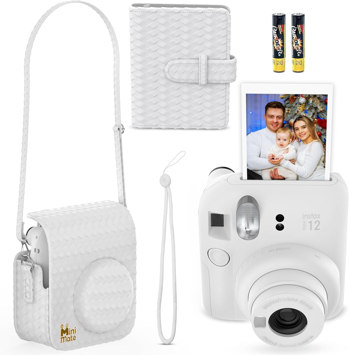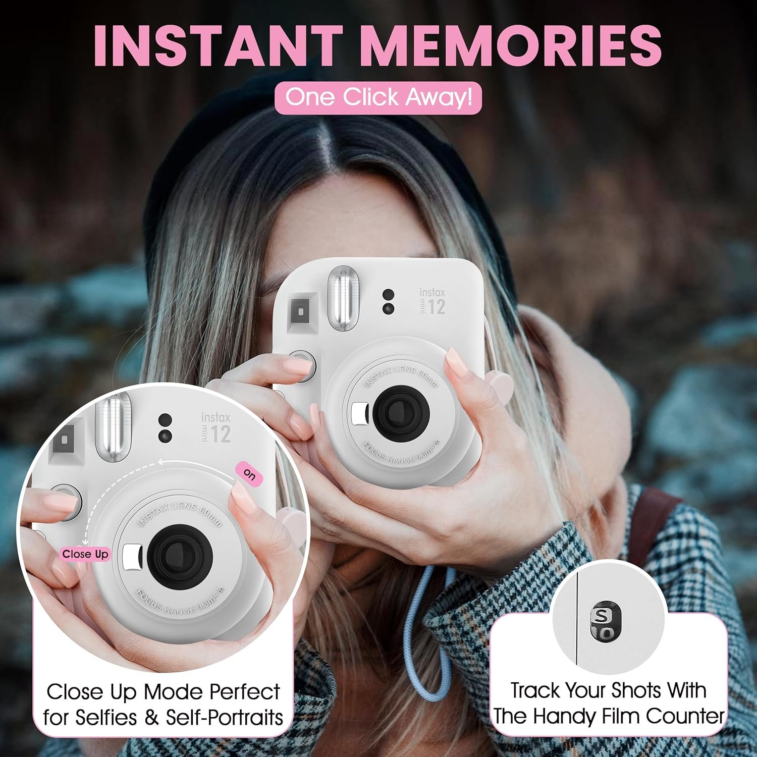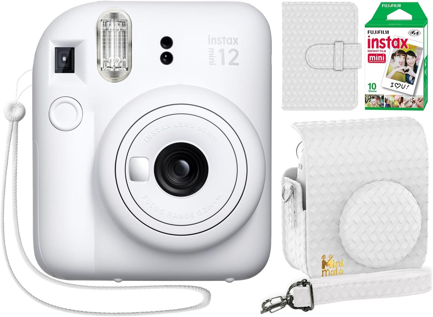 Fujifilm Instax Mini 12 Instant Camera Clay White + 10 Intax Film + Custom Accessory Bundle