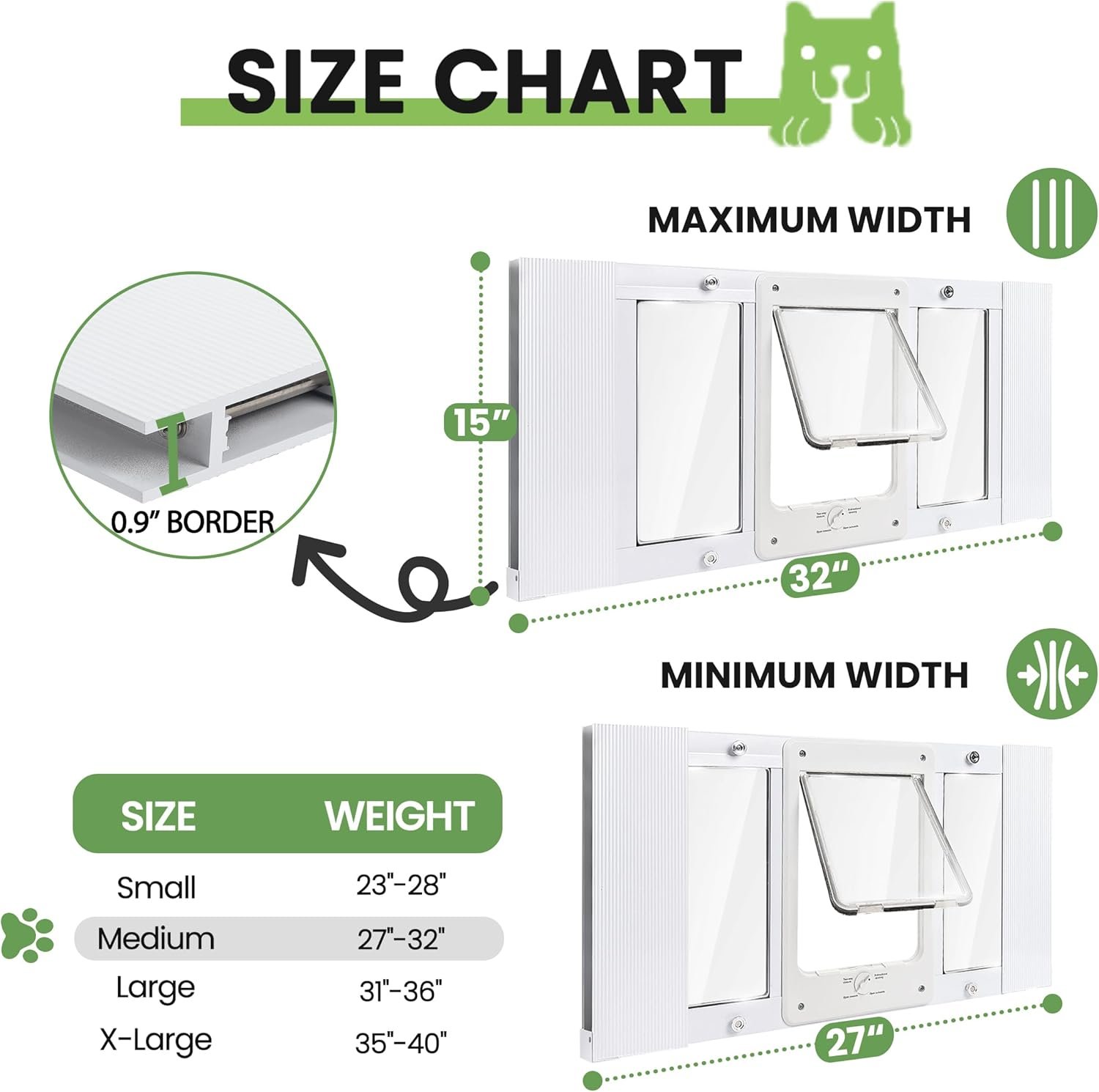 【PURCHASE GUIDE】Suitable for sash windows with a width of 28″-32″.Flap size: 7.8″W ✖ 10.6″H. Door frame height: 15″. Door frame thickness: 0.9″.Before purchasing, please make sure to measure the window width according to the provided method. Otherwise, the purchased product may be too large or too small, making it unusable.