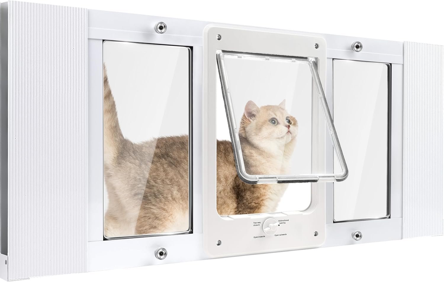 【MULTI-MODE LOCK】This pet door for window lock integrates four locking mechanisms: two-way closing, two-way opening, outward opening, and inward opening. The tightness of the door lock has been adjusted to achieve an ideal state that is both easy to operate and difficult to move by lively pets.