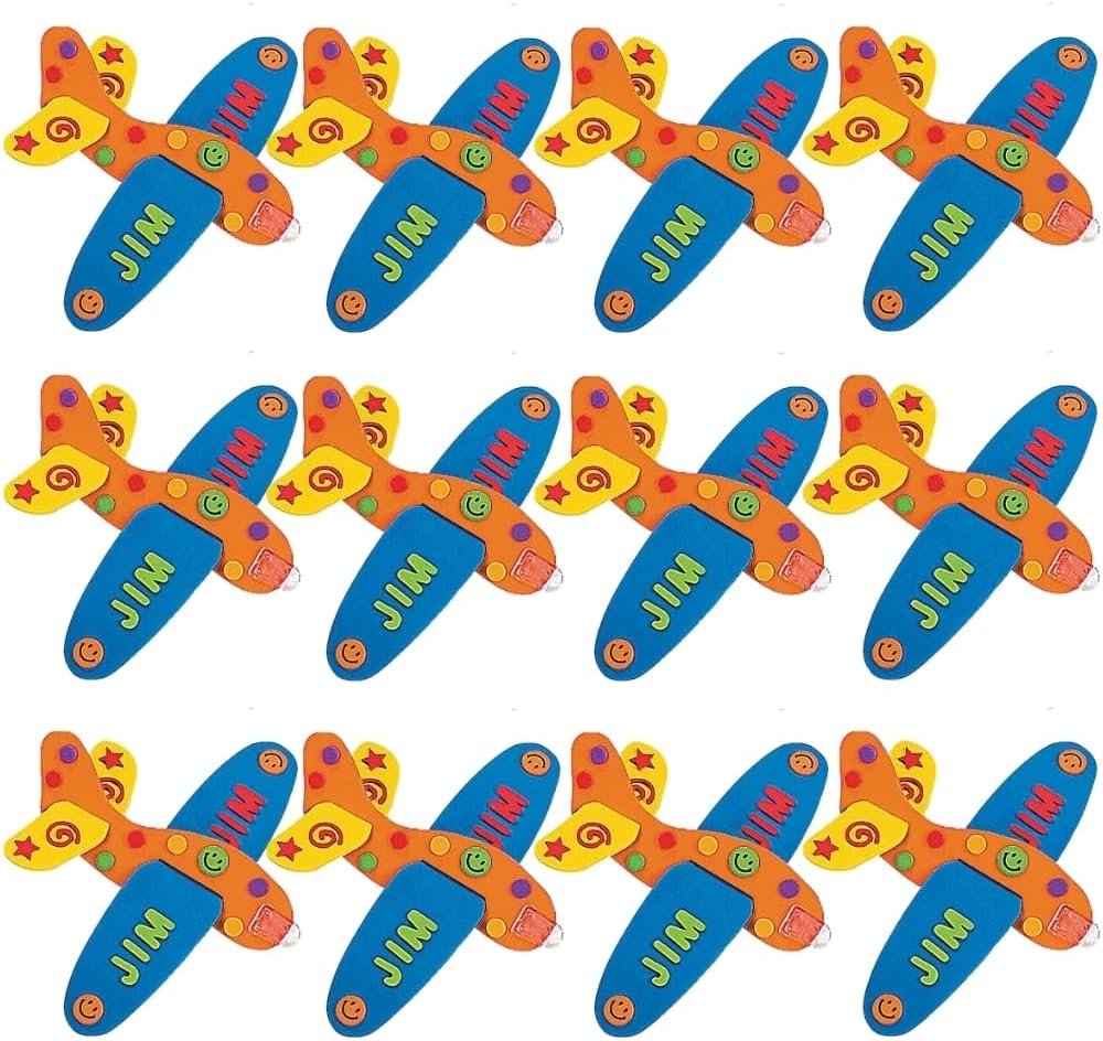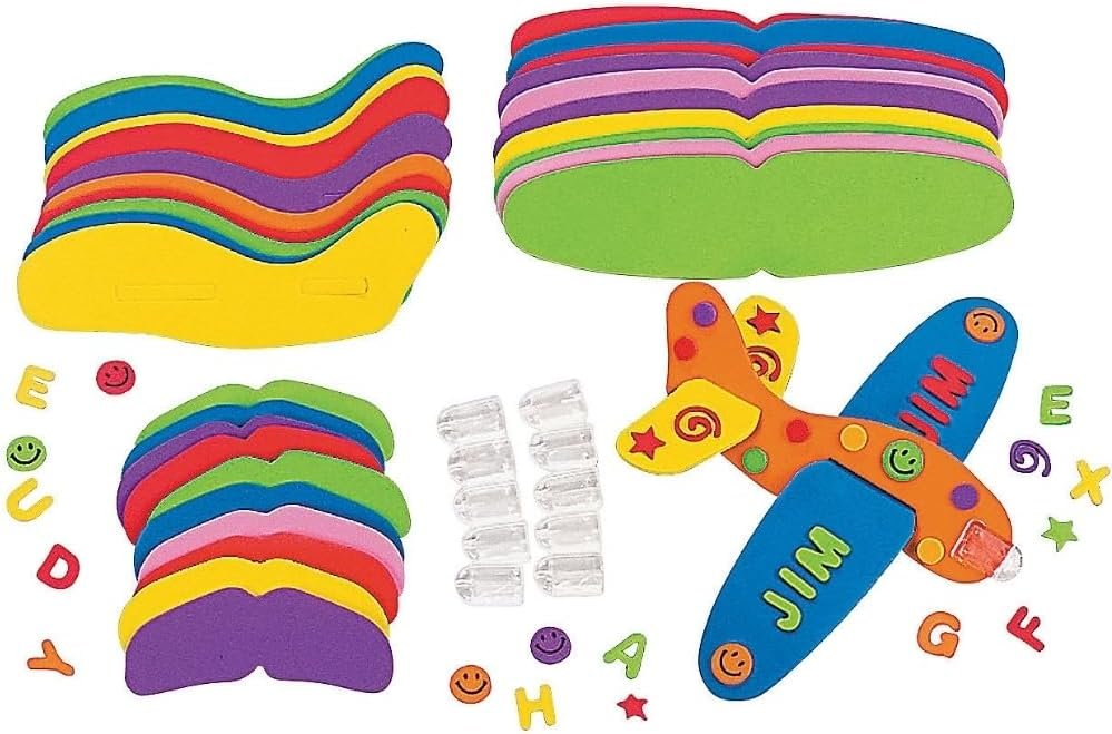 Complete airplane craft kit includes 12 foam glider planes ready to decorate with 229 self-adhesive foam shapes and stickers, perfect for birthday party crafts and group activities that encourage creativity