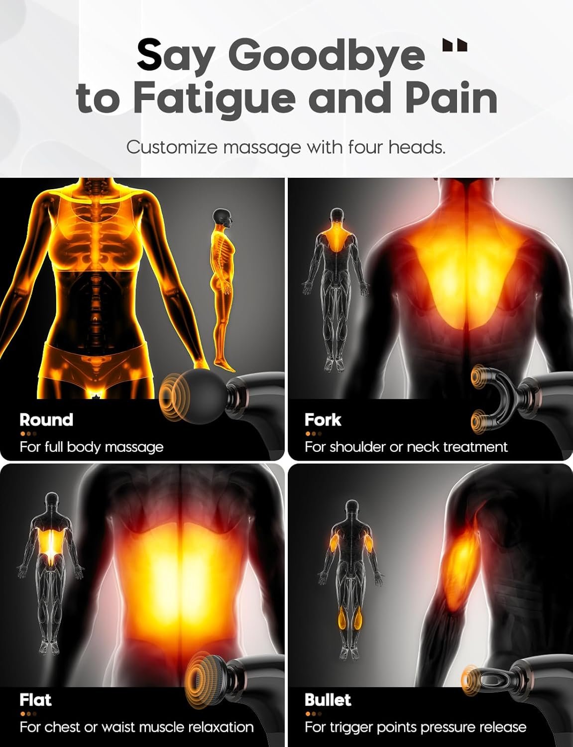 4 𝙄𝙉𝙏𝙀𝙍𝘾𝙃𝘼𝙉𝙂𝙀𝘼𝘽𝙇𝙀 𝙃𝙀𝘼𝘿𝙎 𝘼𝙉𝘿 5 𝙎𝙋𝙀𝙀𝘿 𝙇𝙀𝙑𝙀𝙇𝙎: Equipped with 4 massage heads & 5 speed levels adjustable angle for personalized percussion massage device for pain relief. With 5 speeds 1000-2600RPM and revolutionary u-shaped back massager body massager with extended handle perfect for athletes men women dad him providing deep tissue back and shoulder massage comfort