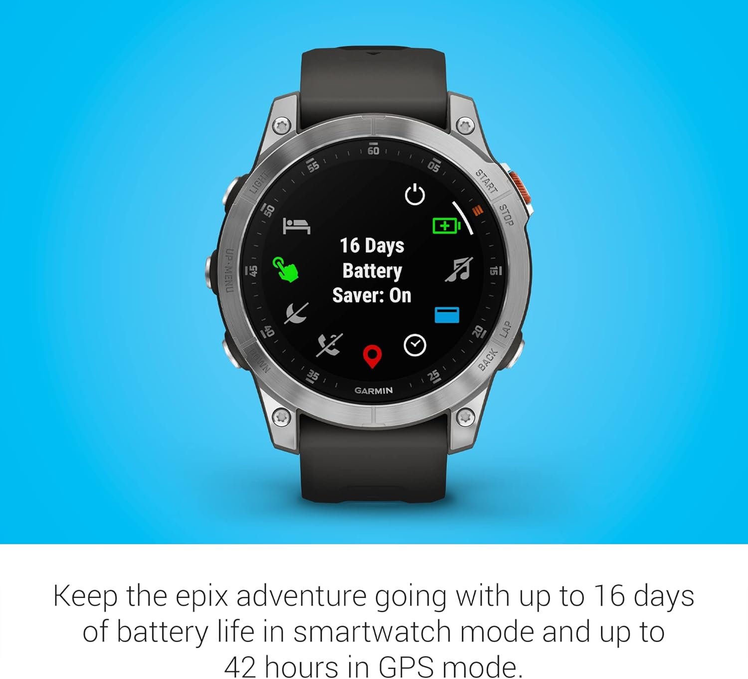 Wear epix™ (Gen 2), be epic. With epix, the premium active smartwatch, you can take on every day with the stunning AMOLED display and up to 16 days of battery life in smartwatch mode. Stay connected with smart features, music storage and get even more functionality on the wrist with Garmin Pay™ contactless payments in supported countries and payment networks. Understand your body with 24/7 health and wellness monitoring features that track Pulse Ox, heart rate, respiration and more (this device is intended to be an estimation of your activity and metrics; it is not a medical device). Train how you want with 30+ built-in sports apps, and take it further with performance metrics and Garmin Coach training plans. When you’re ready for adventure, you can download TopoActive mapping via Wi-Fi® connectivity, or get it preloaded on Sapphire editions. Plus, Sapphire editions support multi-band GNSS technology for stronger, better, more accurate positioning in challenging environments.