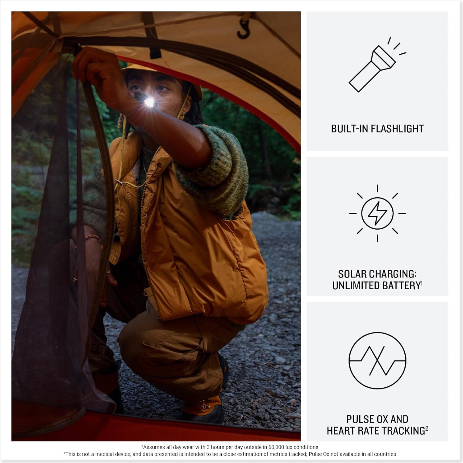 Make a bold statement with this rugged GPS smartwatch, featuring a 0.9” display with solar charging lens and unlimited battery life with solar charging (assumes all-day wear with 3 hours per day outside in 50,000 lux conditions)