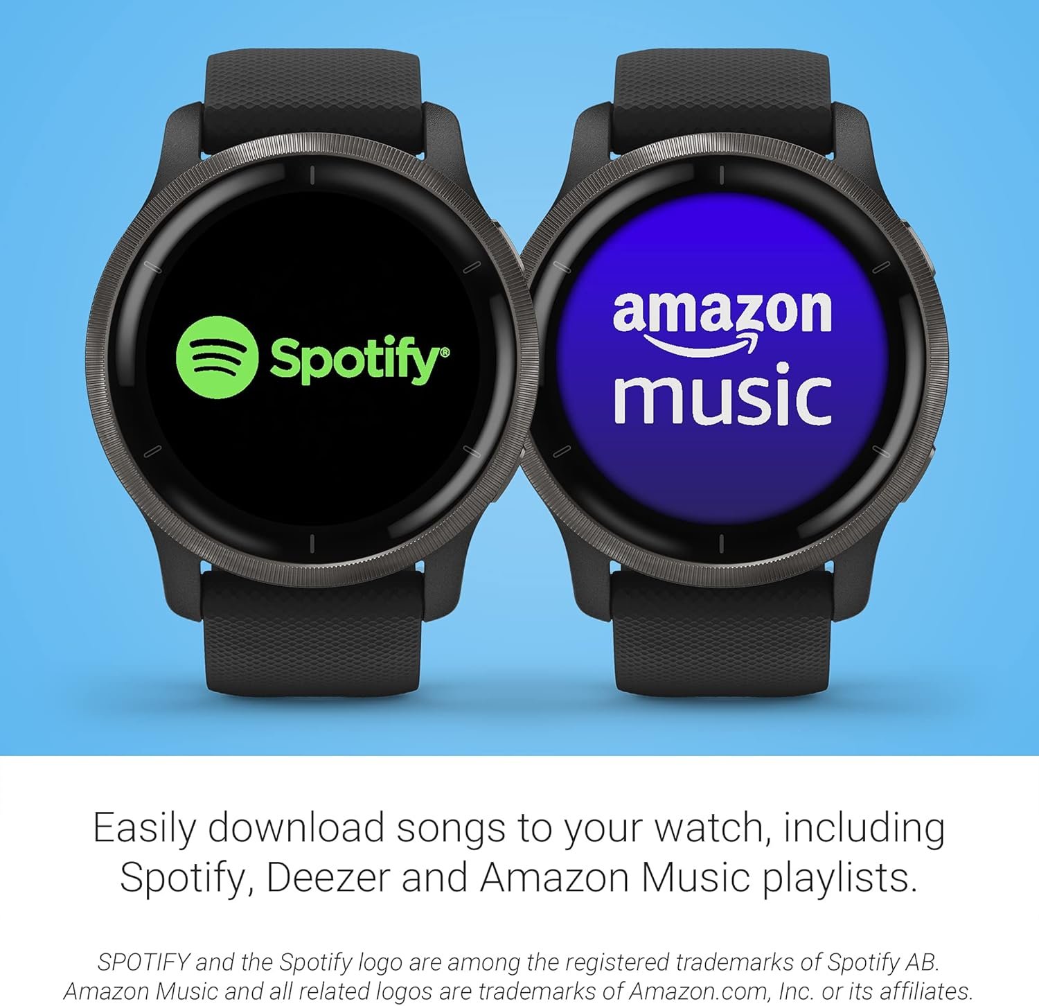 Download up to 650 songs to your watch, including playlists from Spotify, Amazon Music or Deezer (may require a premium subscription), and connect with wireless headphones (not included) for phone-free listening