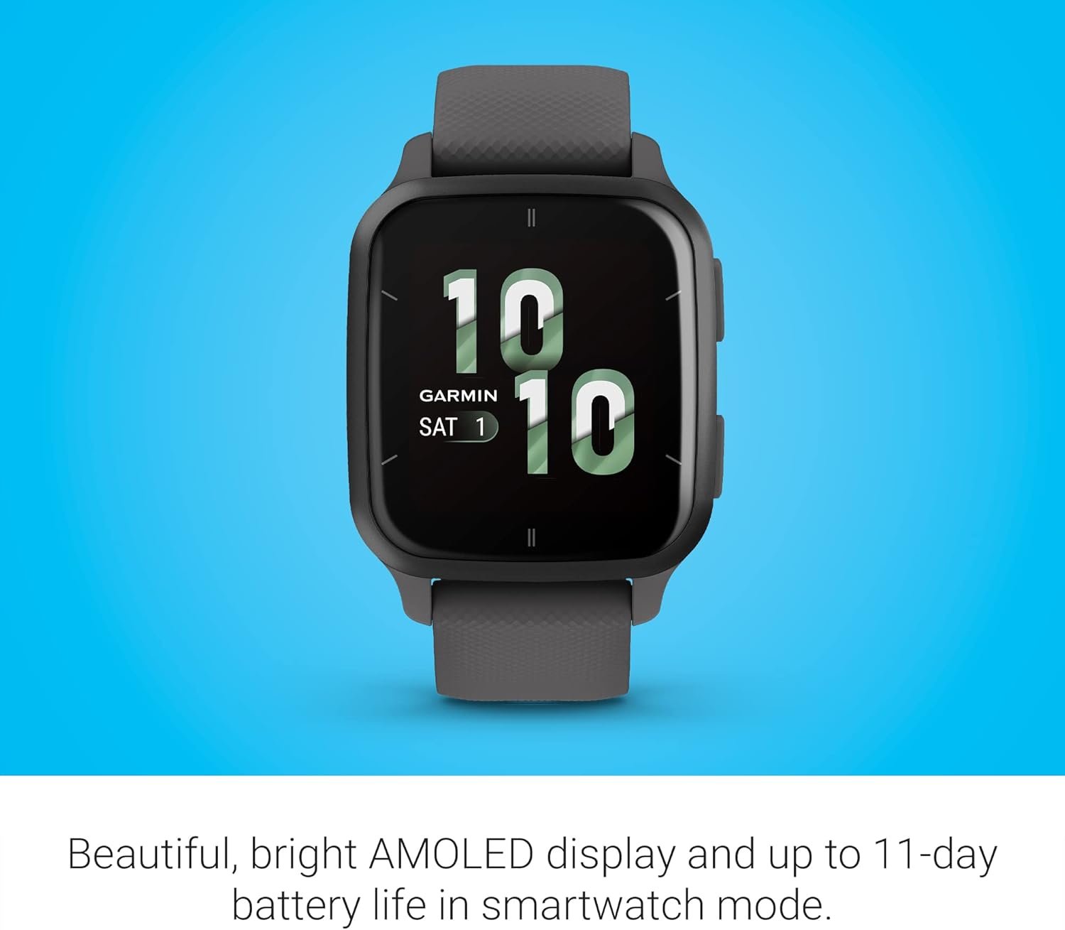 Let’s find a new way to move with the Venu® Sq 2 smartwatch. Featuring a bright AMOLED display, this GPS smartwatch combines daily style with health monitoring and fitness features that inspire you to connect mind and body. With up to 11 days of battery life, you won’t have to take off your watch every night to charge it — which means a more complete 24/7 picture of your health. Get heart rate, sleep score, stress tracking, Body Battery™ energy levels and so much more (This device is intended to give an estimate of your activity and metrics). With 25 preloaded sports apps for indoor or outdoor activities, you can try something new, including running, cardio, strength, HIIT and more. Never miss a call or text with smart notifications delivered to your wrist when paired to your Apple® or Android™ smartphone. Get detailed health and fitness data plus workouts in the free Garmin Connect™ smartphone app.