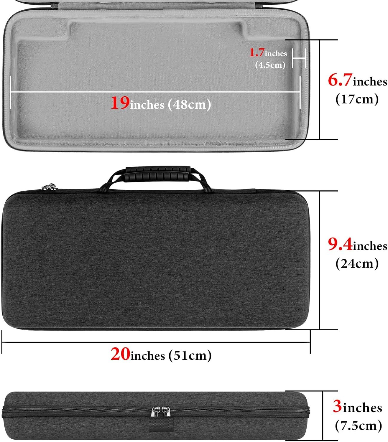 Maximum compatible keyboard dimensions (case inside): 19 x 6.7 x 1.7 inches (48 x 17 x 4.5 cm).