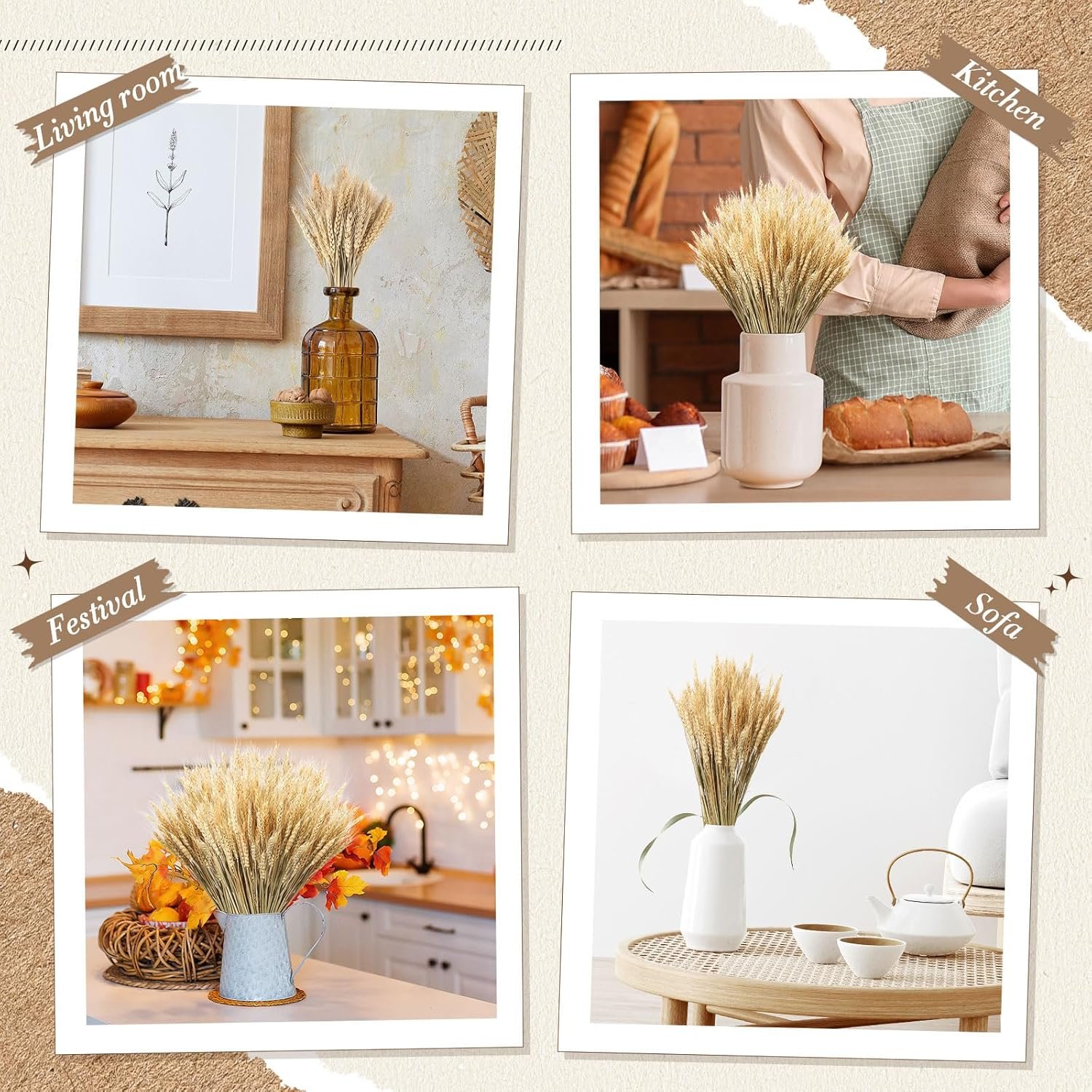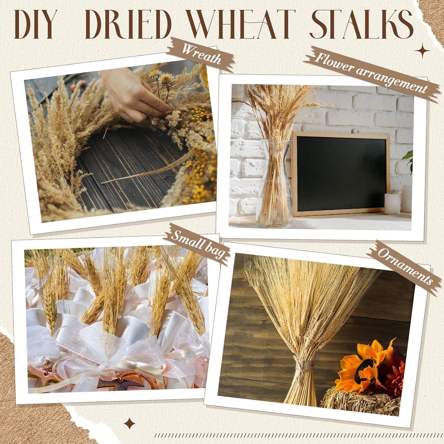 Package You Receive: You will receive about 6-9 bundles, a total of 600 dried wheat stalks for decor, which is sufficient, and you can also DIY the bundles yourself; they are designed in gold, eye catching and beautiful, and can meet your different decoration needs