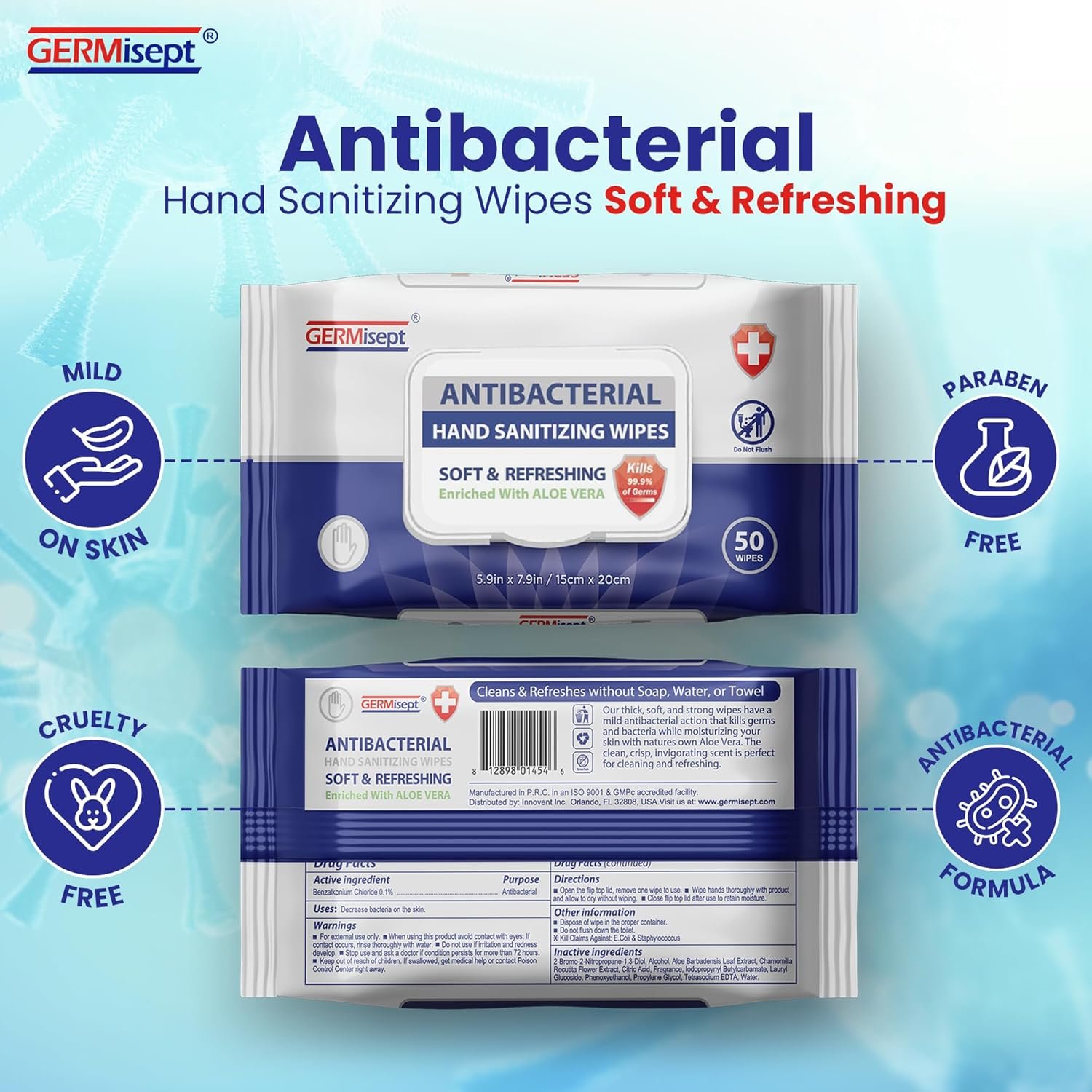 TRAVEL-FRIENDLY PACKAGING: Travel-Friendly 50-Count Pack for On-the-Go Hygiene: Germisept Hand Sanitizing Wipes are designed with your convenience in mind. The 50-count pack is compact and travel-friendly, making it easy to carry with you wherever you go. Whether you’re commuting to work, traveling on an airplane, or simply running errands, these wipes can be effortlessly stowed in your bag or pocket, ensuring that cleanliness and hygiene are always within reach.