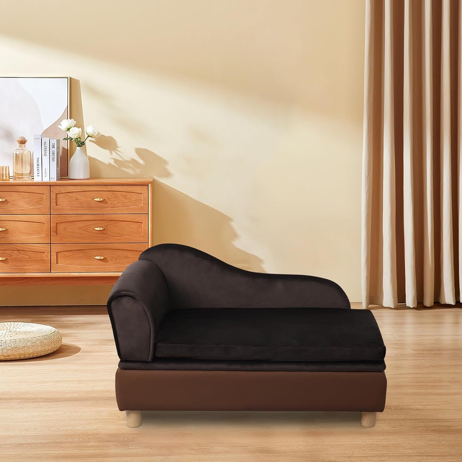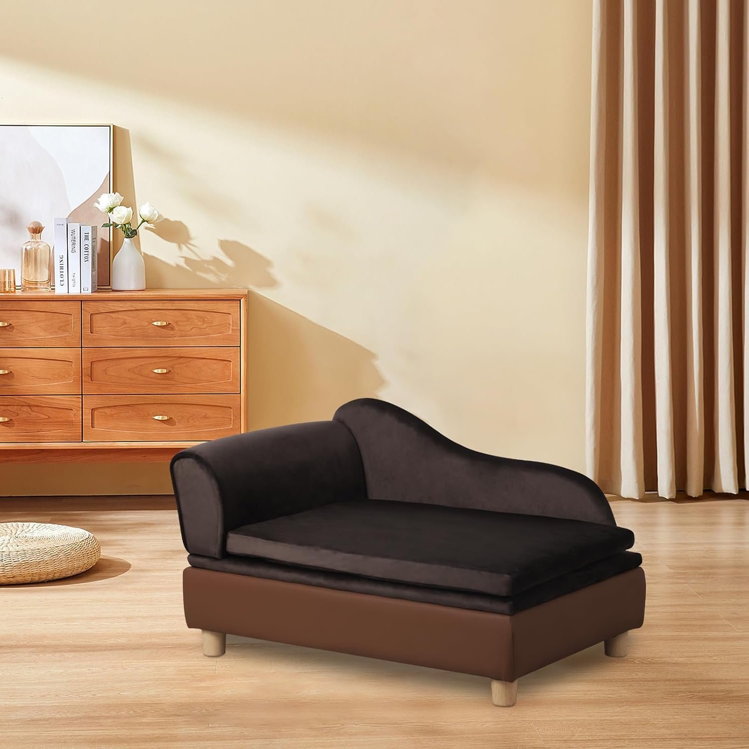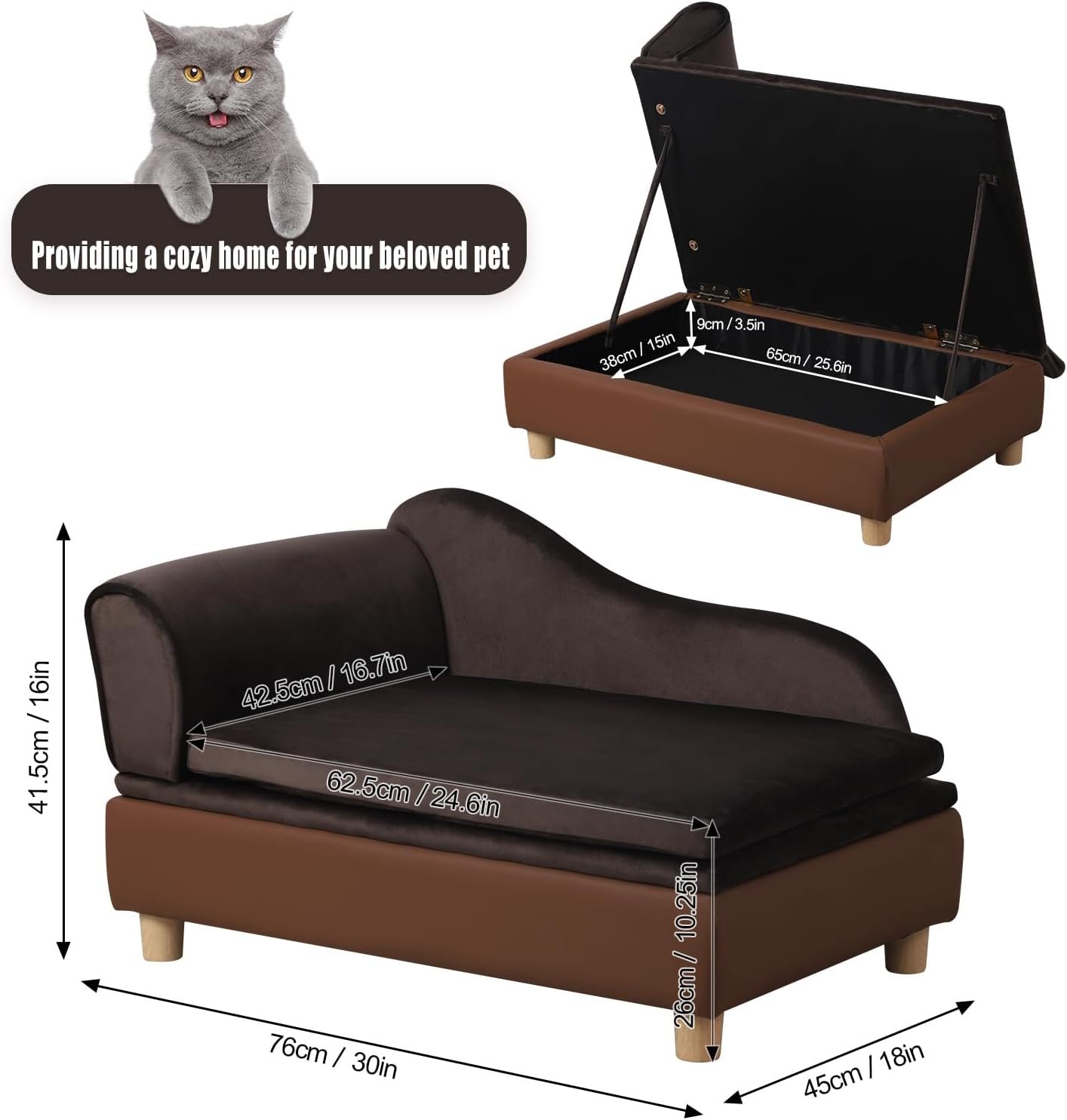 PET SOFA SIZE: 30″ L x 18″ W x 16″ H. Cushion size: 24.6” L*16.7” W. Storage: 25.6″ L x 15″ W x 3.5″ H. Recommend for schnauzer, chihuahua, shih tzu, pomeranian, maltese, Pekingese, Bichon Frise, Boston Terrier, British Shorthair, American Shorthair, Siamese and so on