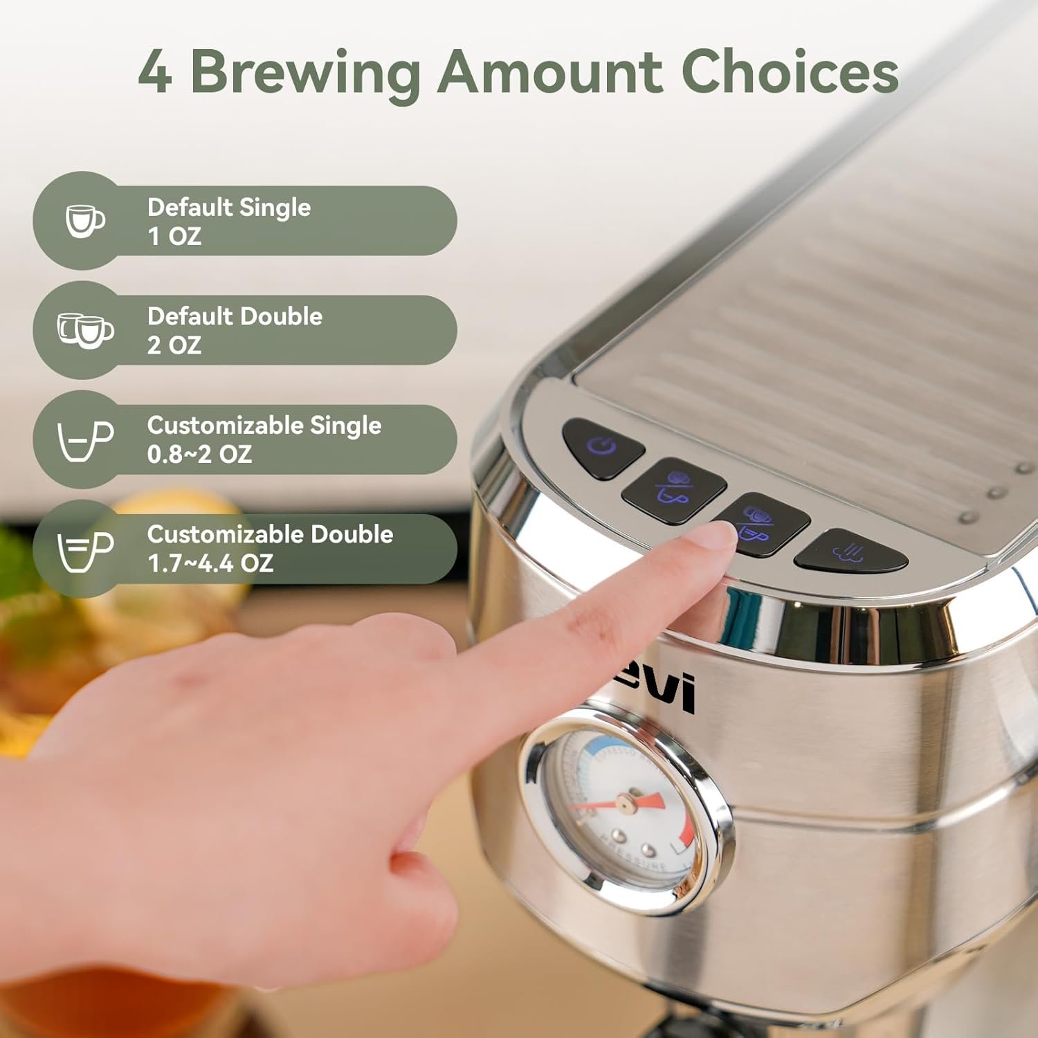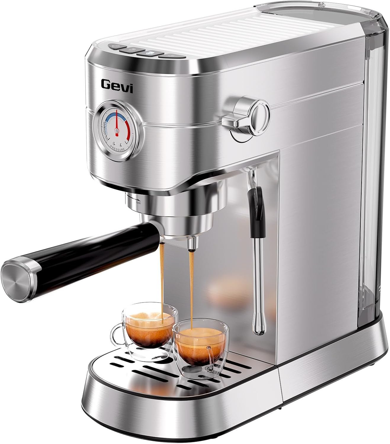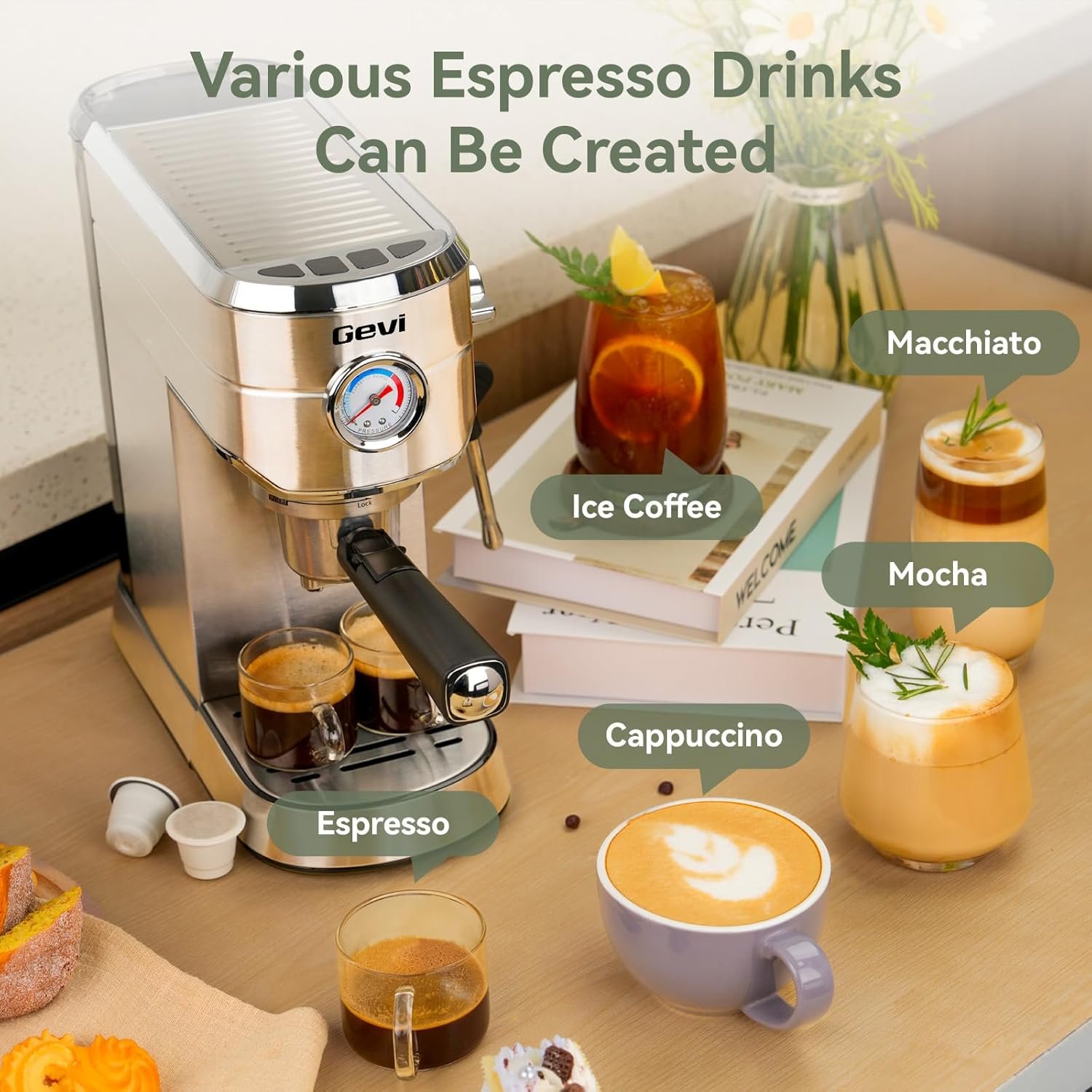 𝐄𝐧𝐣𝐨𝐲 𝐃𝐞𝐥𝐢𝐜𝐢𝐨𝐮𝐬 𝐄𝐬𝐩𝐫𝐞𝐬𝐬𝐨 𝐂𝐨𝐟𝐟𝐞𝐞 𝐃𝐫𝐢𝐧𝐤𝐬 – Equipped with a 20-bar pump, NTC temperature control, pre-infusion feature, and a pressure gauge, the Gevi stainless steel espresso coffee machines with a milk frother allows you to craft a range of café-quality beverages. From Mocha to Macchiato, Espresso to Americano, this expresso machine is not only ideal for home or office use but also makes a perfect gift for father, friends, and loved ones.
