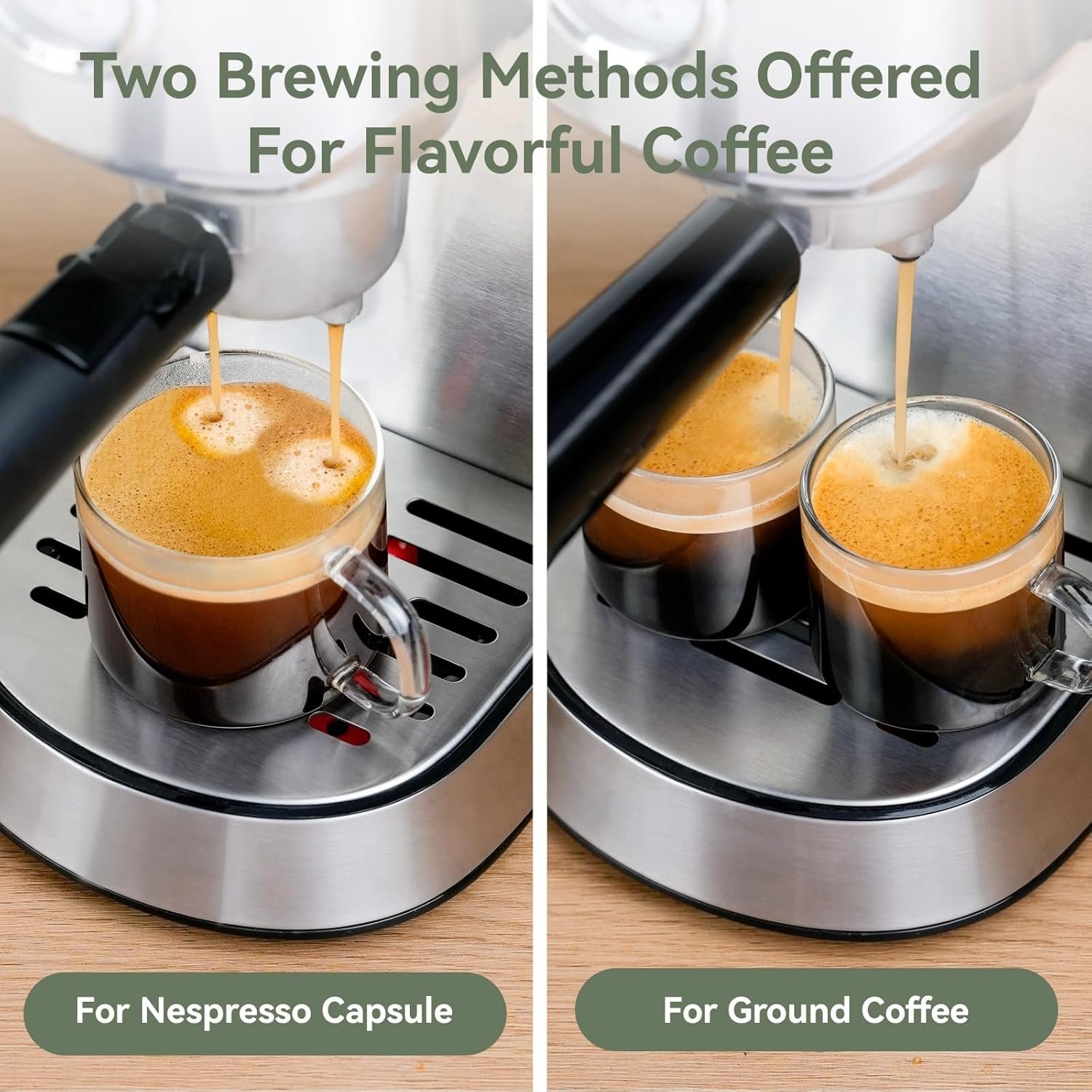 𝐌𝐮𝐥𝐭𝐢-𝐌𝐞𝐭𝐡𝐨𝐝 𝐂𝐨𝐟𝐟𝐞𝐞 𝐁𝐫𝐞𝐰𝐢𝐧𝐠 – The Gevi espresso machine is equipped with portafilters for both NS capsules and coffee powder, providing the flexibility to brew your favorite coffee beverages using your preferred method. Whether you’re in a rush or have time to spare, you can always enjoy your perfect cup of coffee.