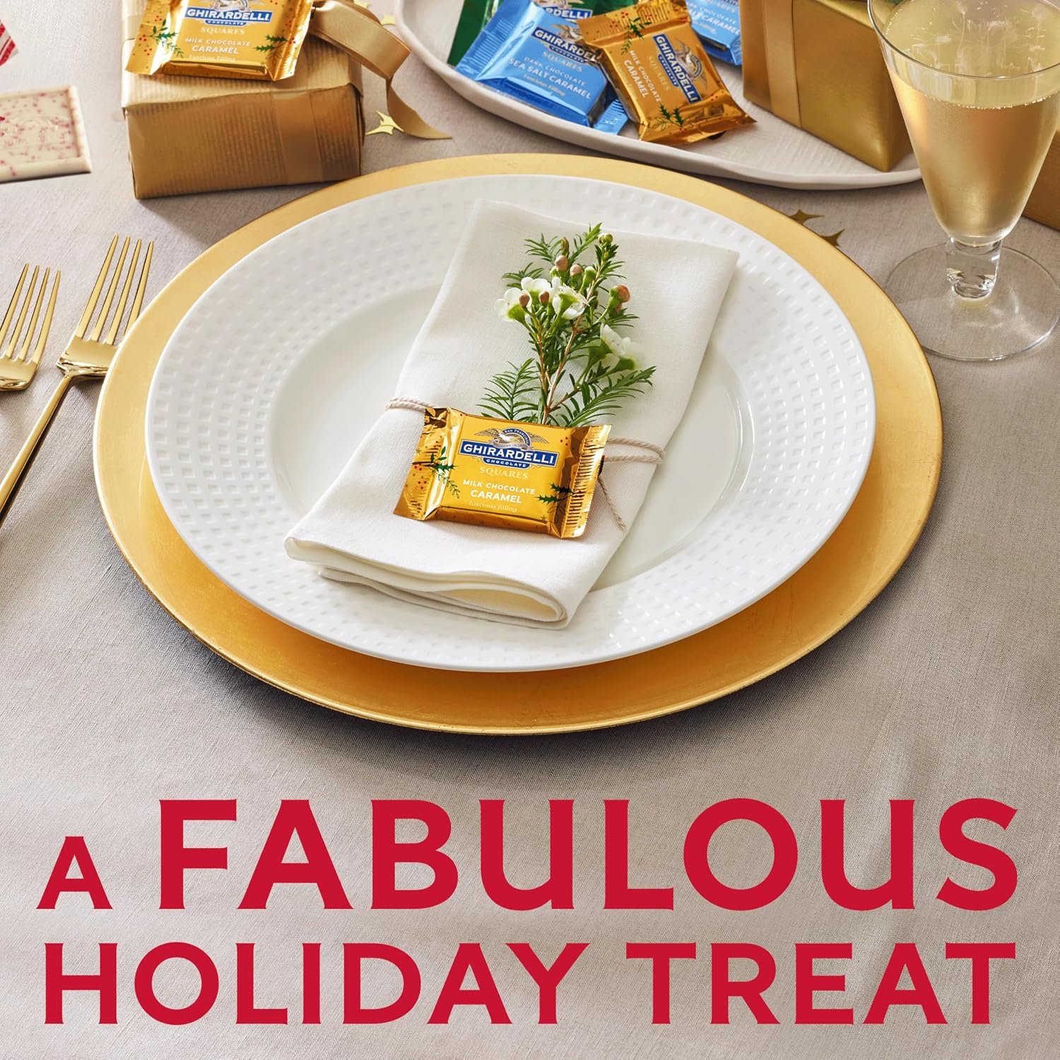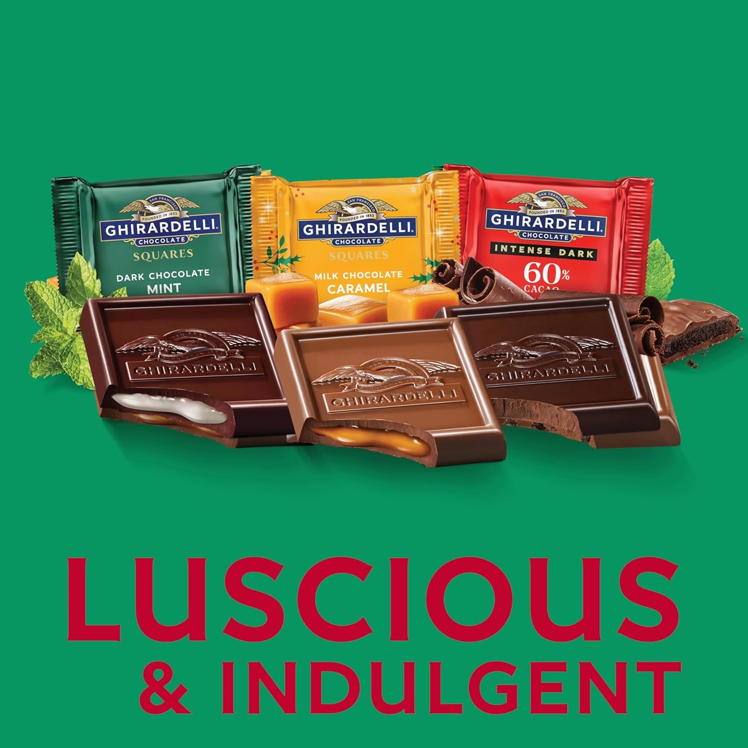 Celebrate the holidays with GHIRARDELLI Holiday Classic Chocolate Assortment SQUARES, a collection of your favorite festive flavors. Each bag includes a delicious mix of Milk Chocolate Caramel, Dark Chocolate Mint, and 60% Cacao Dark Chocolate SQUARES—each individually wrapped for freshness and easy sharing. Made with rich, premium ingredients and GHIRARDELLI’s signature smooth chocolate, these treats are perfect for holiday parties, stocking stuffers, or gifting to friends and coworkers. Add a touch of elegance to your candy bowls or dessert trays and make every moment a little sweeter with GHIRARDELLI.