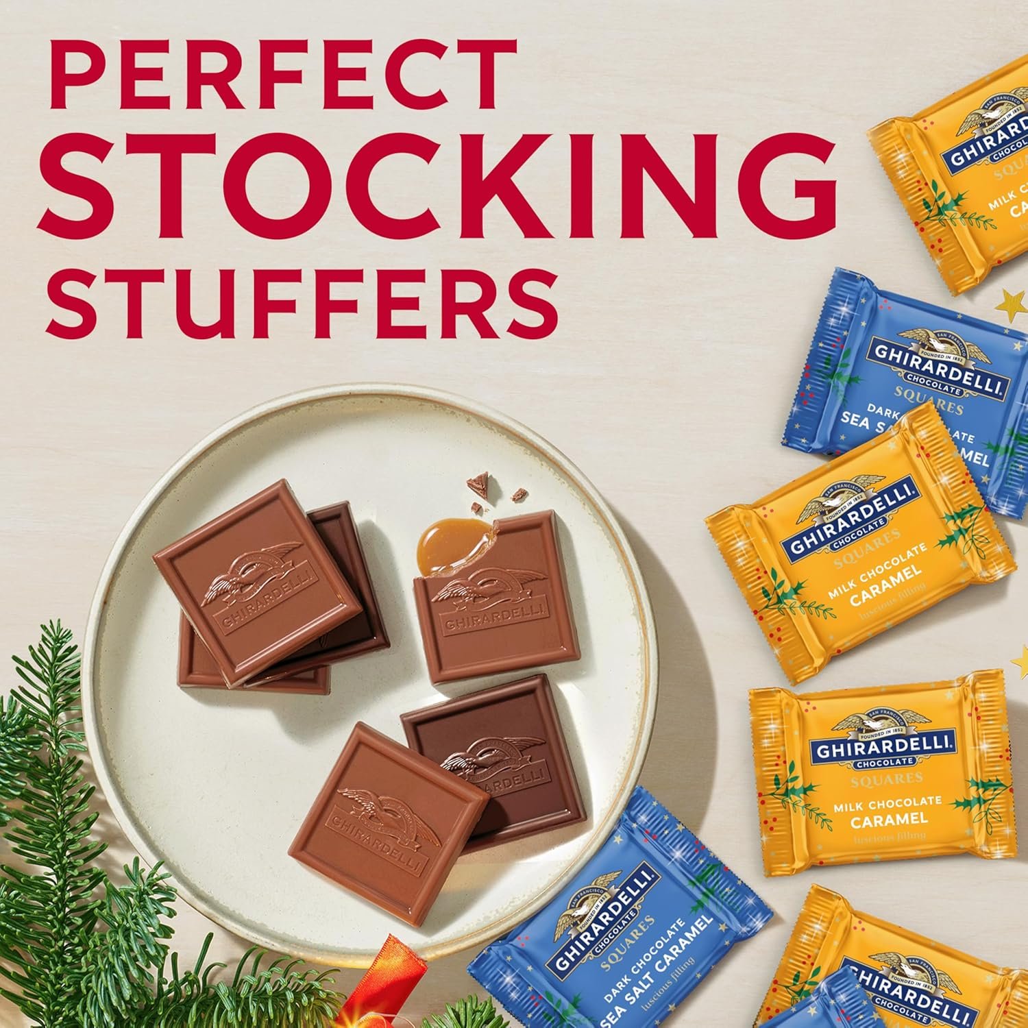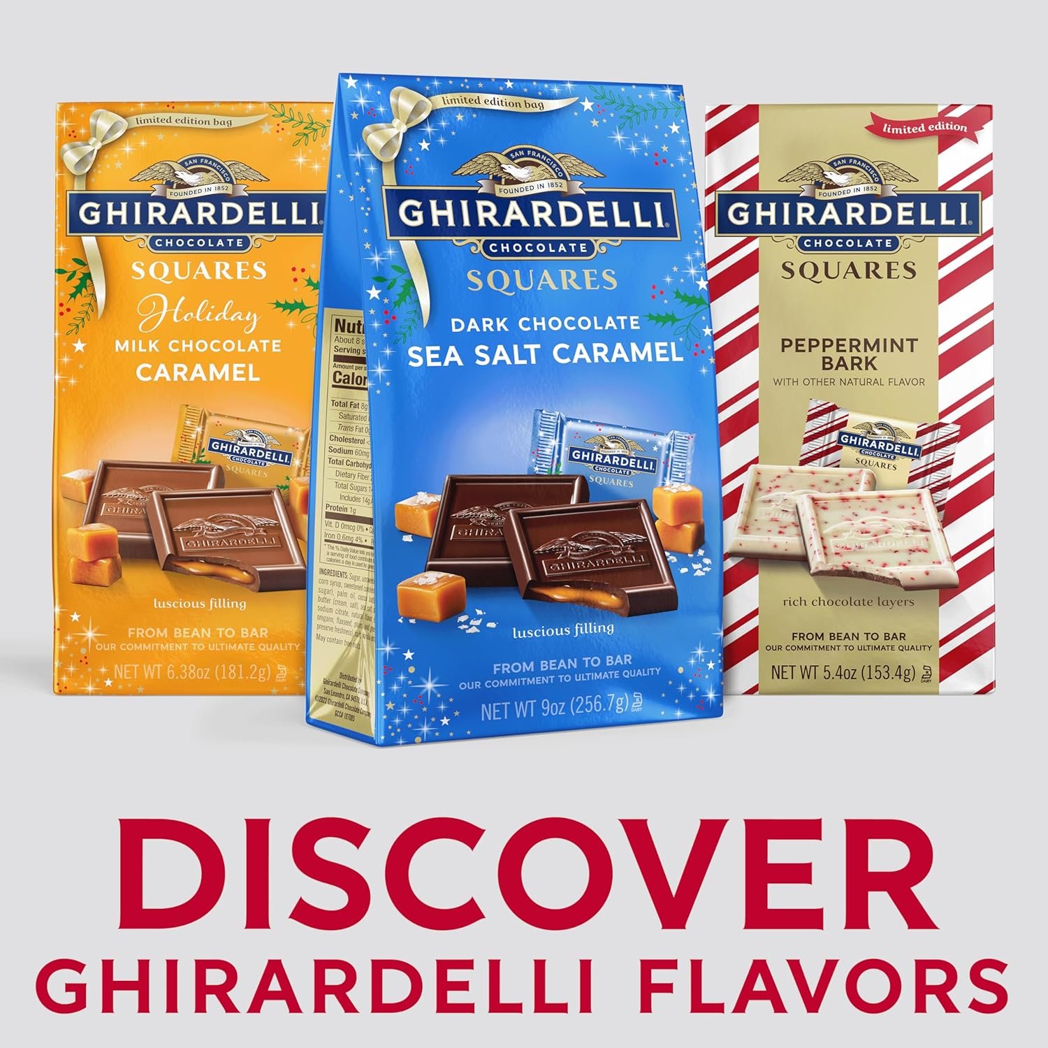 GHIRARDELLI Holiday Dark Chocolate Sea Salt Caramel SQUARES capture the spirit of the season in every bite. Each square features luscious, buttery caramel infused with sea salt and enveloped in rich dark chocolate for a luxurious flavor balance. Perfect for gifting, entertaining, or adding to holiday dessert trays, these individually wrapped chocolates bring elegance and joy to any celebration. Crafted with premium cocoa beans and GHIRARDELLI’s signature smooth texture, they embody quality from bean to bar. Make every festive moment brighter with the indulgent taste of GHIRARDELLI.