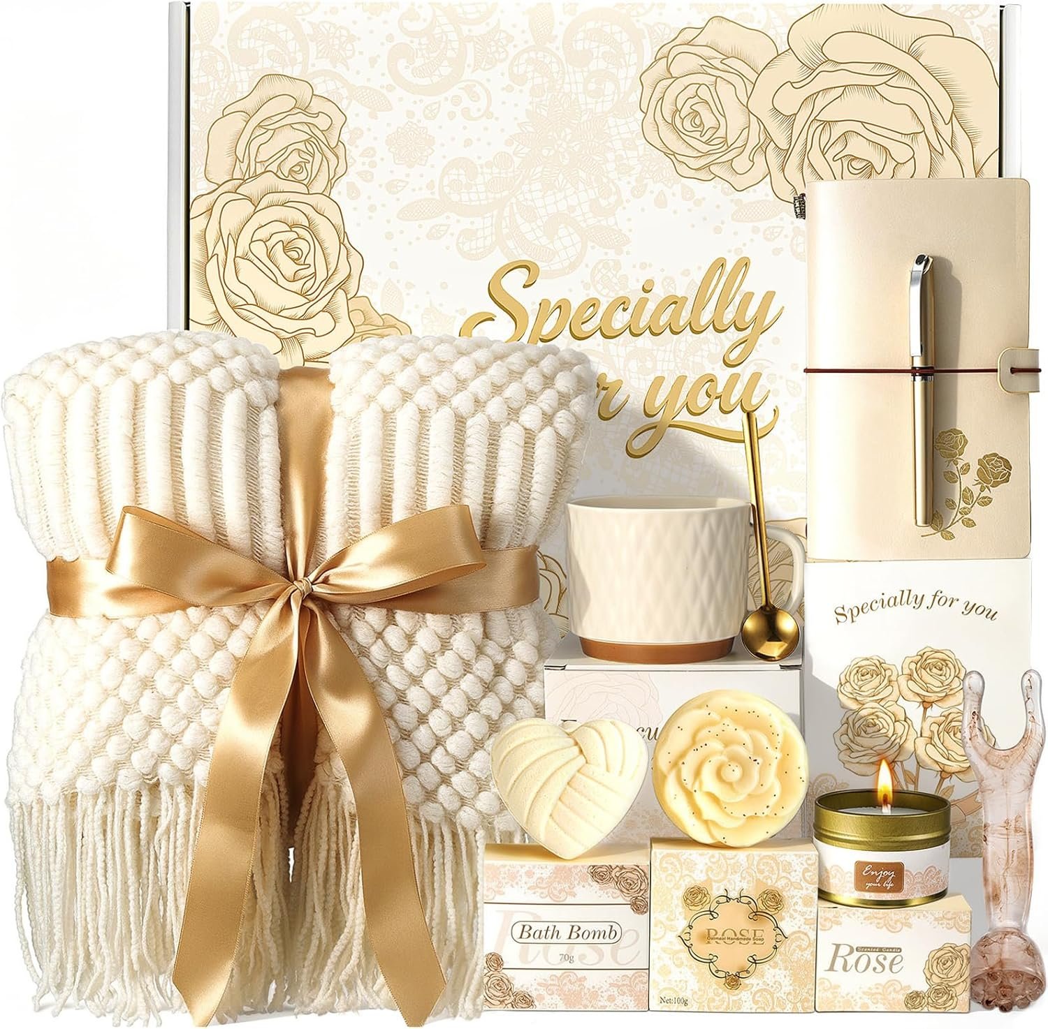 10-PIECE ALL-IN-ONE GIFTS FOR WOMEN: Warm her with 10 well curated thoughtful pieces – 50x67in ivory knitted tassel blanket, 14oz coffee cup w/ stir spoon, 100g 100% soy wax rose scented candle, 100g rose shaped oatmeal handmade soap, 70g chamomile bath bomb, lotus pod beauty wand, 19.7x12cm PU notebook with 0.5mm gel pen, and champagne-colored rose gift card wrapped in a elegant rose box