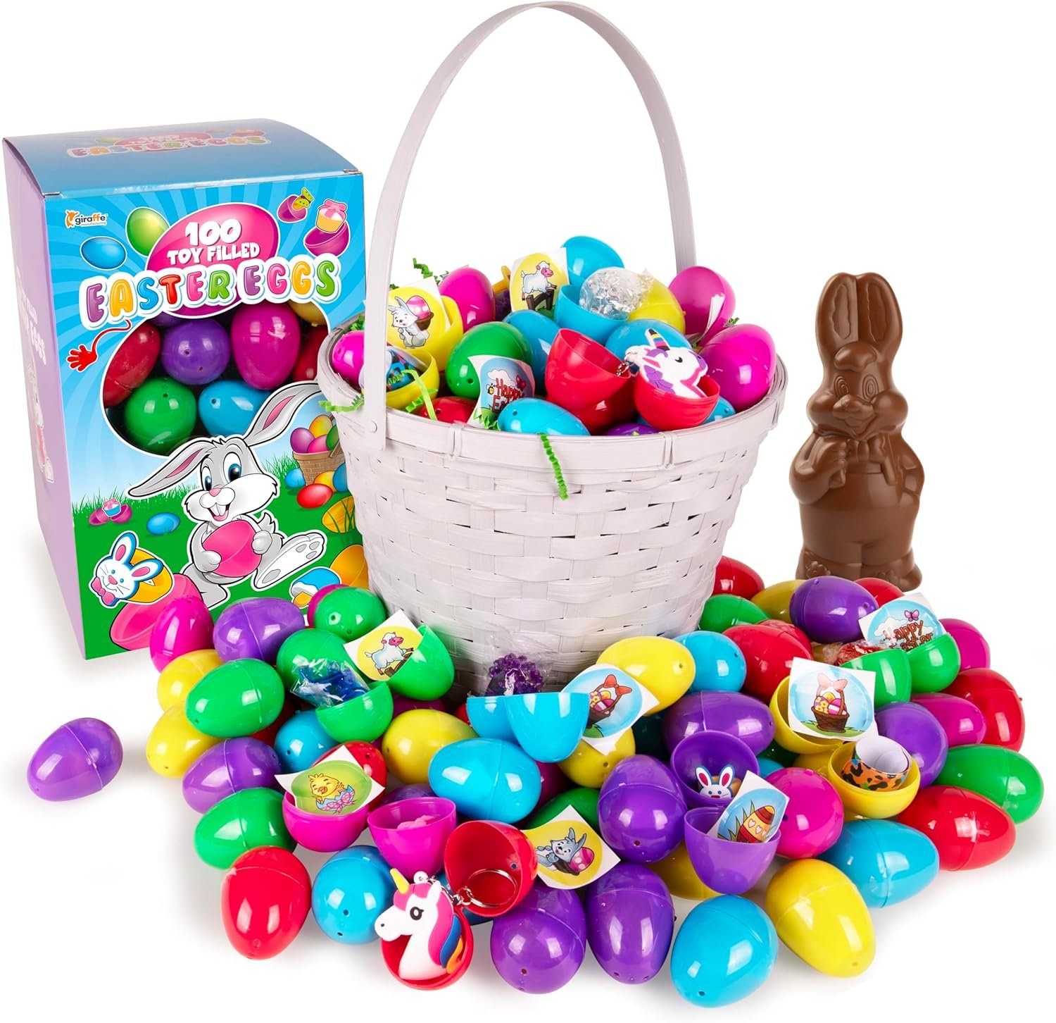 Includes 100 Prefilled Easter Eggs Bulk with Toys like Slap Bracelets, Stickers, Sticky Hands, Unicorn Key chain and Rings as these Pre Filled Bulk Easter Eggs are Ready for Hunts; Hide them or Pop them Open to Discover Treasures