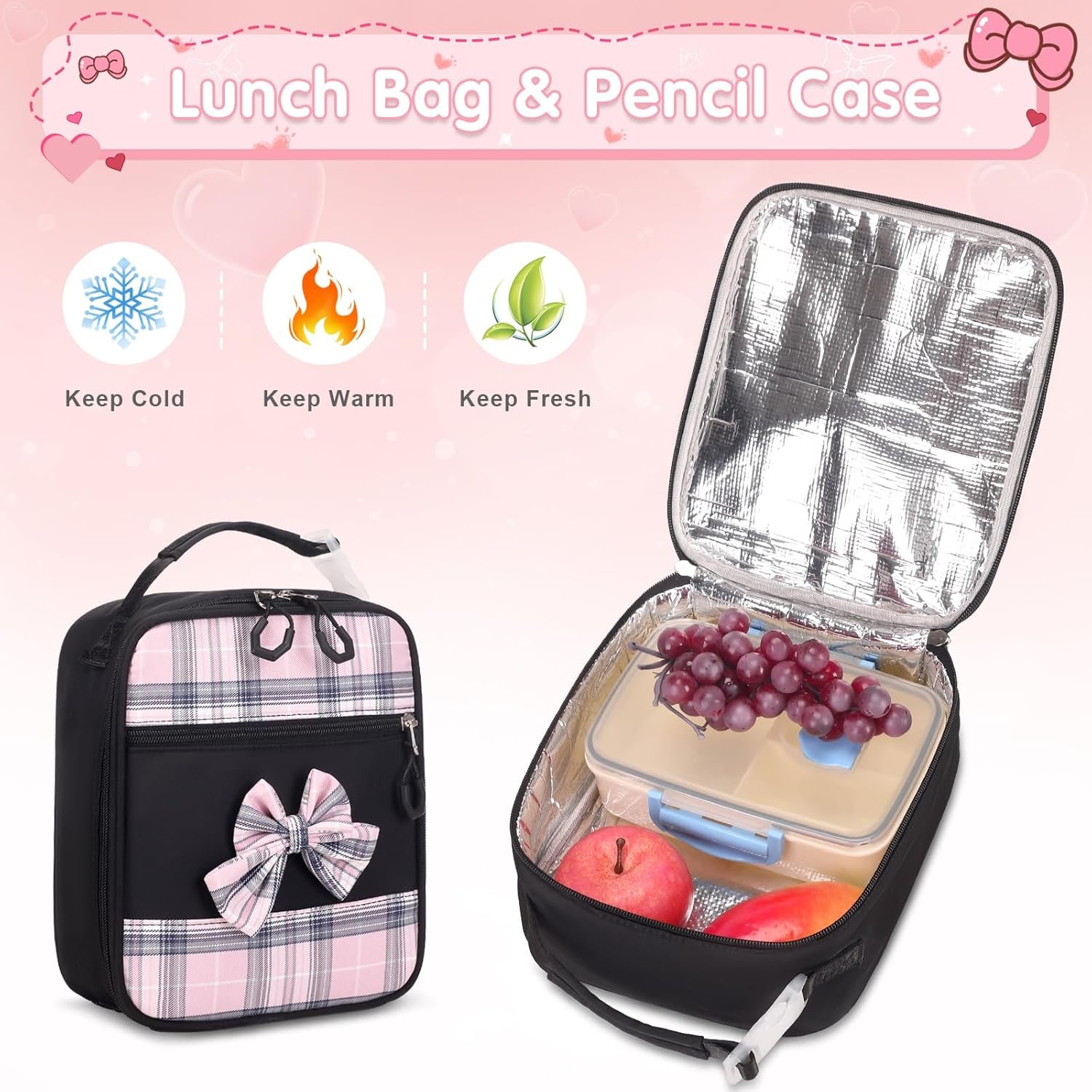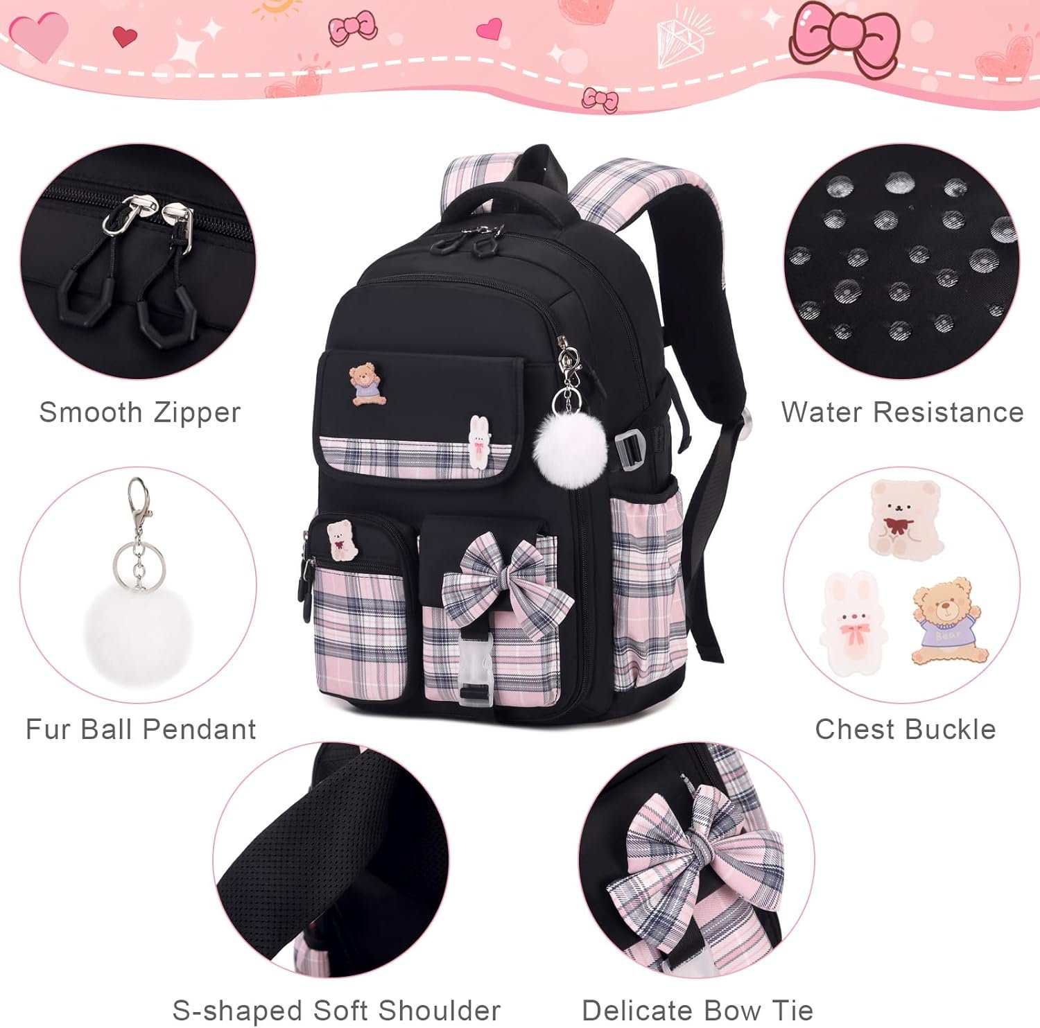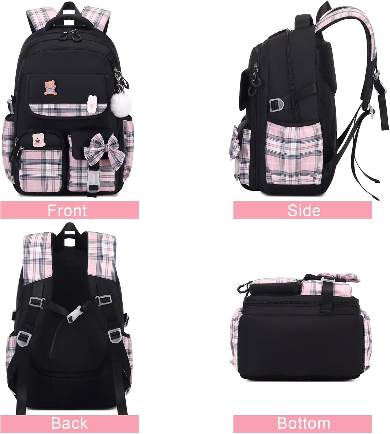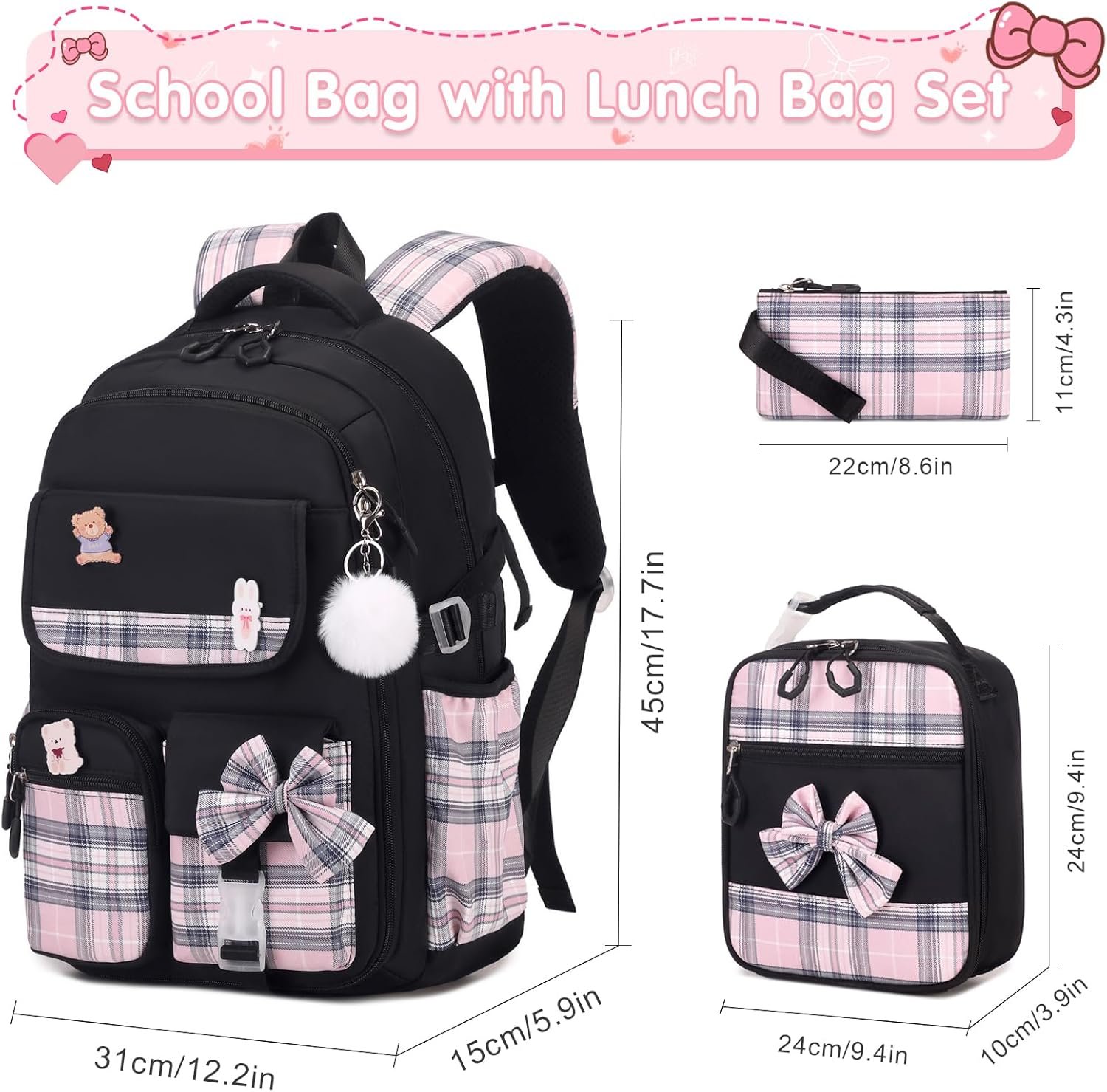 【Unique and Well-Designed】The girls bookbags measurement: 17.7″(H)*12.2″(L)*5.9(W),and the lunch bag measures: 9.4″(H)*8.2″(L)*3.9(W), the pencil case: 4.3″(H)*8.6″(L).Our book bag is a combination of bow and plaid, fulfills the little girl’s princess dream!Whether it’s for school, camping, travel, hiking, or other outdoor activities, this backpack is versatile and stylish.