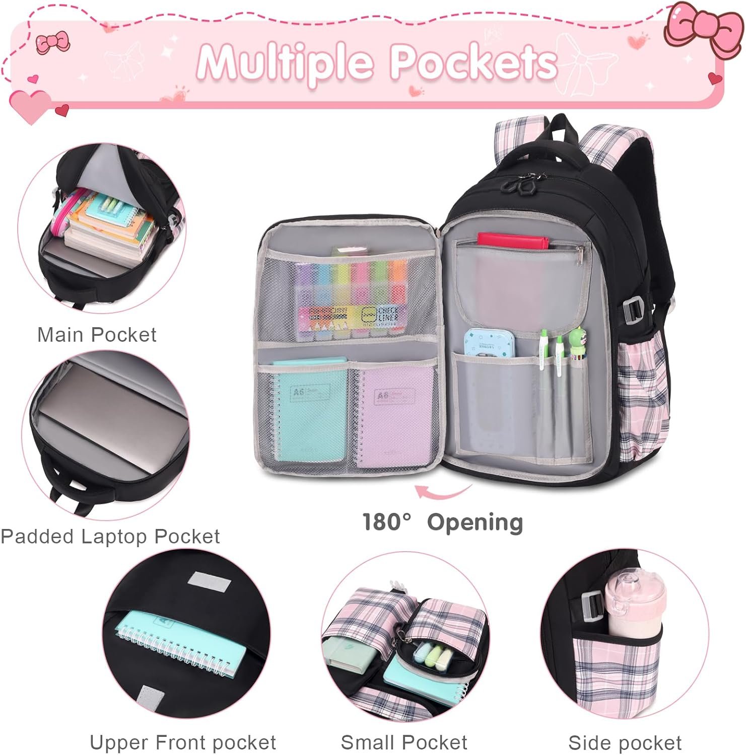 【Multi-Compartment Backpack】Backpack for girls has 180 degree opening large front pocket, The main pocket includes laptop padded sleeve with elastic belt and hidden inner pockets. The front tool pockets also come with multiple compartments, the three front pockets can hold essentials and other small items for your daily organisation. The practical multi-pocket girls backpack will help kids find what they want quickly.