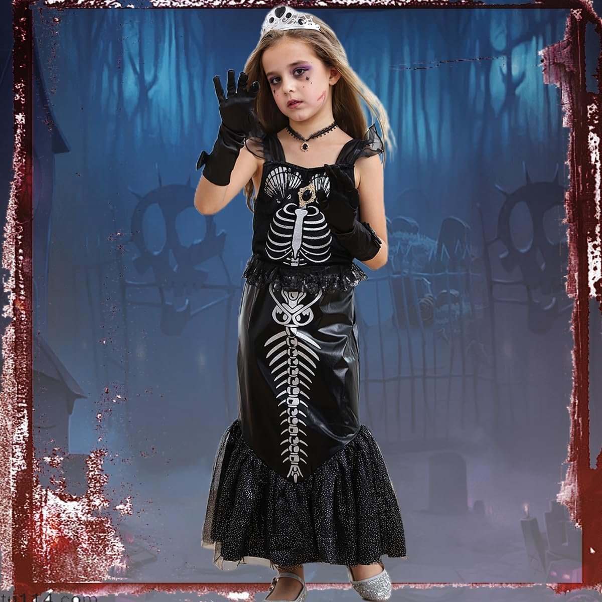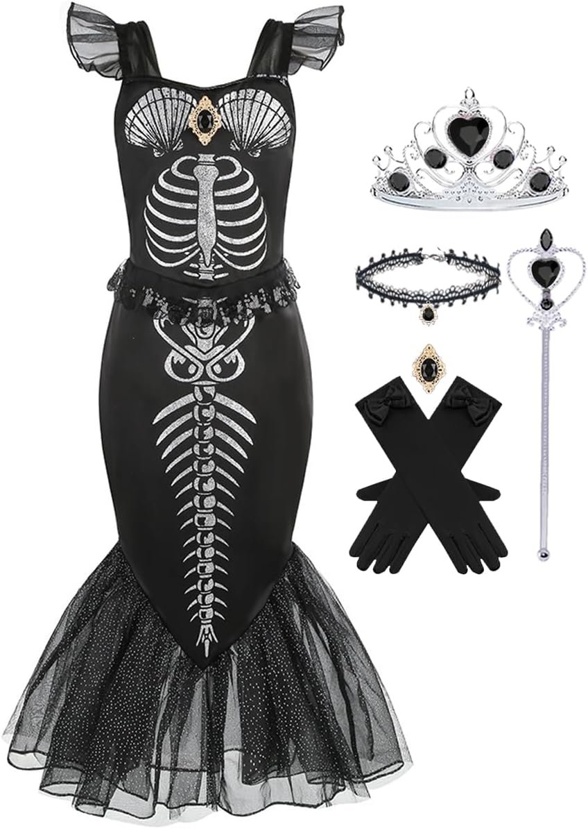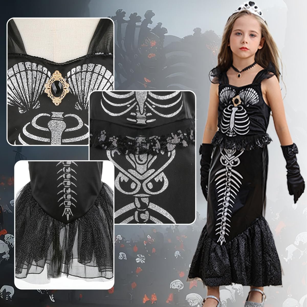 The Black Skeleton Print Mermaid Dress is very unique and will make your little girl the center of attention at a themed party.