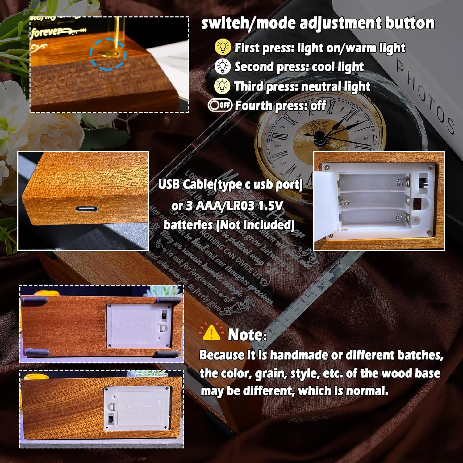 Power supply: The wooden light base has two modes of power supply, one is using 3 AAA/LR03 1.5V batteries, another one is using the USB cable to connect with the computer, car, or portable charger or use a charging plug(Don’t include battery and plug in the package)
