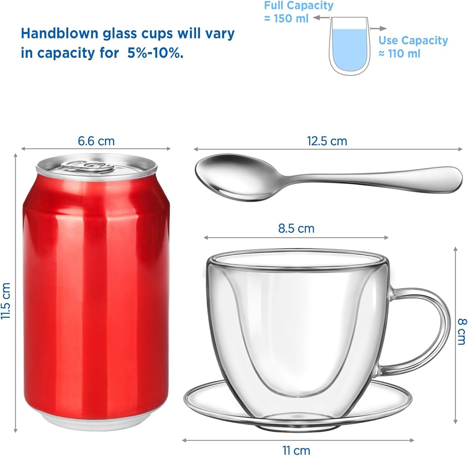 💝What You Get: 2 of Glastal 5oz double-wall espresso cups (recommended use capacity 110ml), 2 saucers, 2 spoons, and friendly product support(within 18 months).