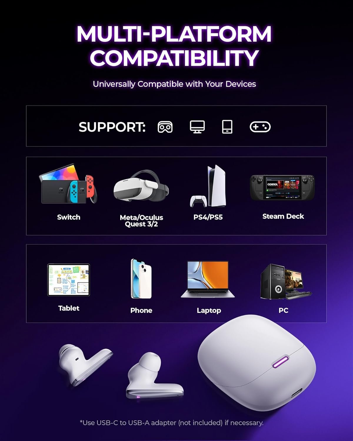 ✅ Dual Connection & Multi-Platform Compatibility: Pair effortlessly with smartphones and VR headsets via Bluetooth 5.4 or connect instantly to PS5, PS4, PC, Quest, and Switch with the 2.4GHz USB-C dongle. Seamlessly switch between phone calls and games without missing a moment. Note: lf you need to connect the transmitter to devices with a USB-A port such as PC,PS5, PS4, Nintendo Switch TV Mode etc. An additional USB-C to USB-A adapter is required. (The adapter is not includedin the package) *When the earphones are connected to the PS5 through the transmitter, the volumecannot be adjusted via touch functions on the earphones.Please adiust the earphone volume on the PS5.