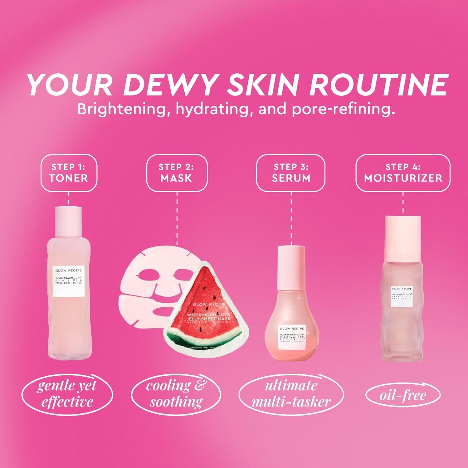 Bright, Bouncy Finish – Layer Watermelon Glow Dew Drops for instant radiance and even tone, then seal with Pink Juice Moisturizer for lightweight, oil-free hydration. Together, they reveal a fresh, glassy, radiant complexion.