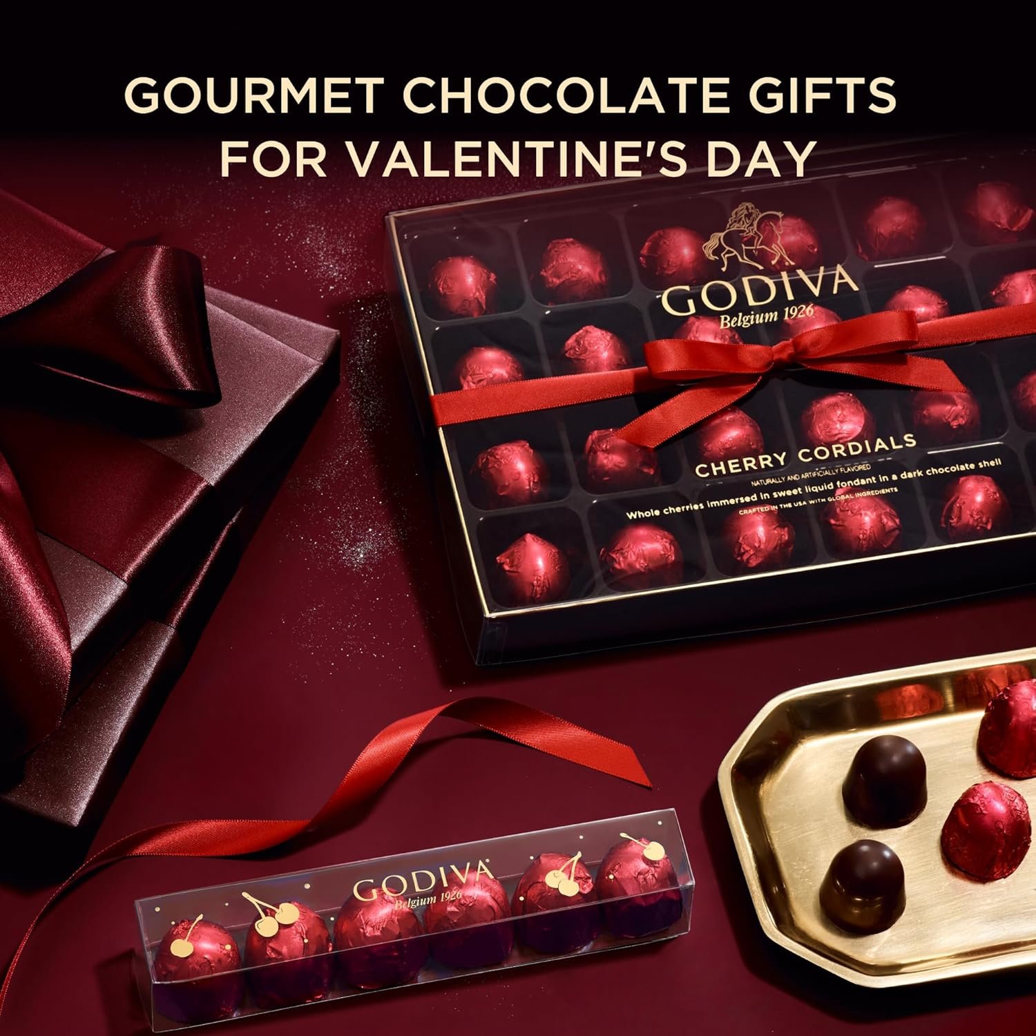 Celebrate love with the Godiva Cherry Cordial Gift Box, a 24-piece assortment that combines the timeless taste of rich Godiva chocolate with the sweet allure of cherries. Each cordial is carefully crafted, featuring a smooth, decadent chocolate shell that gives way to a juicy cherry center, creating a perfectly balanced bite that is both indulgent and romantic. This harmonious pairing of flavors is an ideal treat for Valentine’s Day, offering an experience that feels luxurious, thoughtful, and unforgettable. Designed with gifting in mind, the Cherry Cordials are presented in an elegantly decorated box adorned with refined accents and finished with a striking red ribbon. The sophisticated packaging makes this collection a ready-to-give gift, perfect for surprising a partner, presenting as a romantic gesture, celebrating with friends, or enhancing a Valentine’s gift basket. Its eye-catching design and thoughtful presentation make it as delightful to give as it is to receive, ensuring it stands out among other chocolate gifts. Each piece is individually wrapped, making them perfect for sharing with a loved one, creating intimate dessert moments, or adding to a romantic spread. The combination of elegance, convenience, and gourmet flavor ensures that these cherry cordials bring joy to every Valentine’s celebration, from cozy evenings together to grand romantic gestures. Since 1926, Godiva has honored its Belgian heritage by crafting chocolates that balance artistry, quality, and creativity. Every cherry cordial reflects this tradition, blending fine ingredients with nearly a century of expertise to create a chocolate that delights the senses and elevates the act of giving.