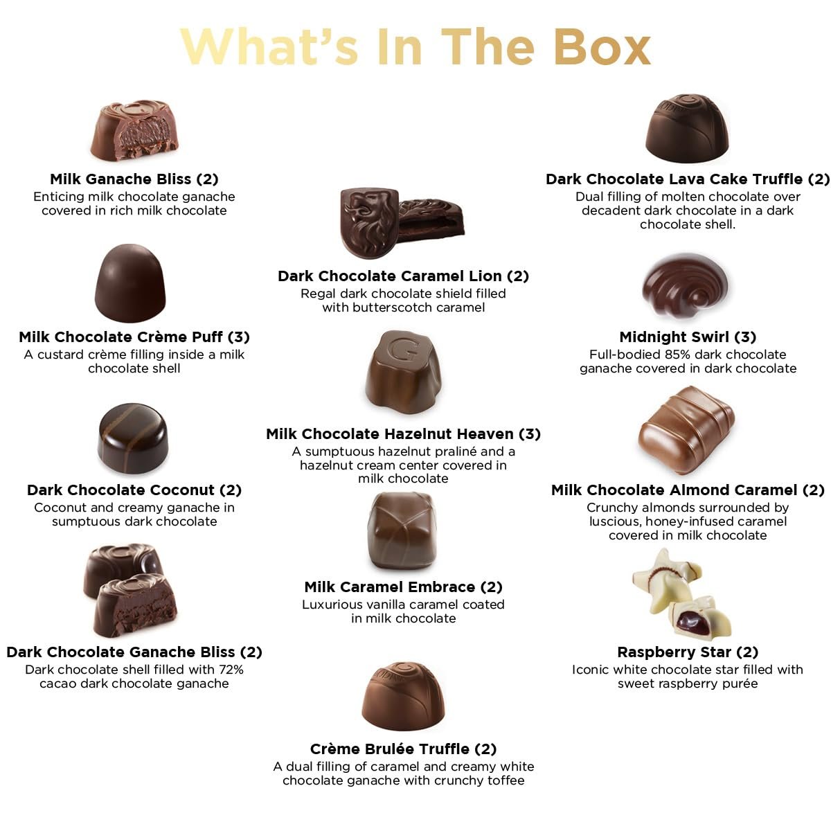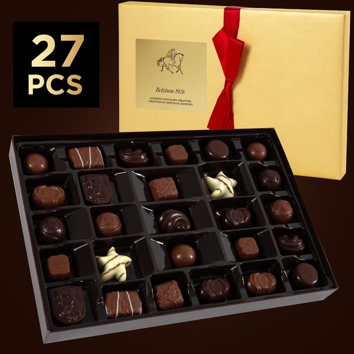 EXQUISITE CHOCOLATE GIFT BOX – Elevate your celebrations with the valentine’s day chocolate candy gift box. This luxurious 27-piece assortment of Belgian chocolates is a masterpiece of flavor and presentation. Delight in the perfect candy gift box balance of milk, white, and dark chocolate shells, each filled with gourmet treasures such as ganaches, nuts, caramels, and pralines.