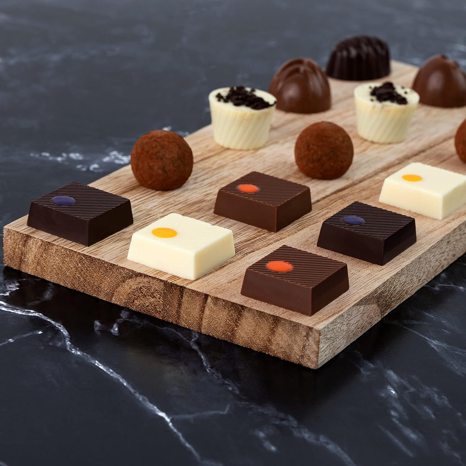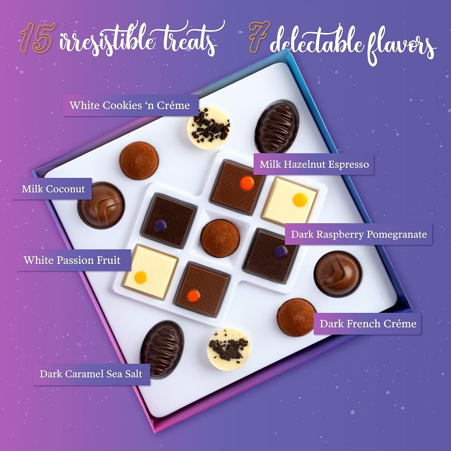 TRY ALL 7 DELICIOUS FLAVORS: This collection features 15 truffles in 7 decadent flavors including: Dark French Crème, White Cookies n Crème, Dark Caramel Sea Salt, Milk Coconut, Dark Raspberry Pomegranate, Milk Hazelnut Espresso and White Passionfruit.