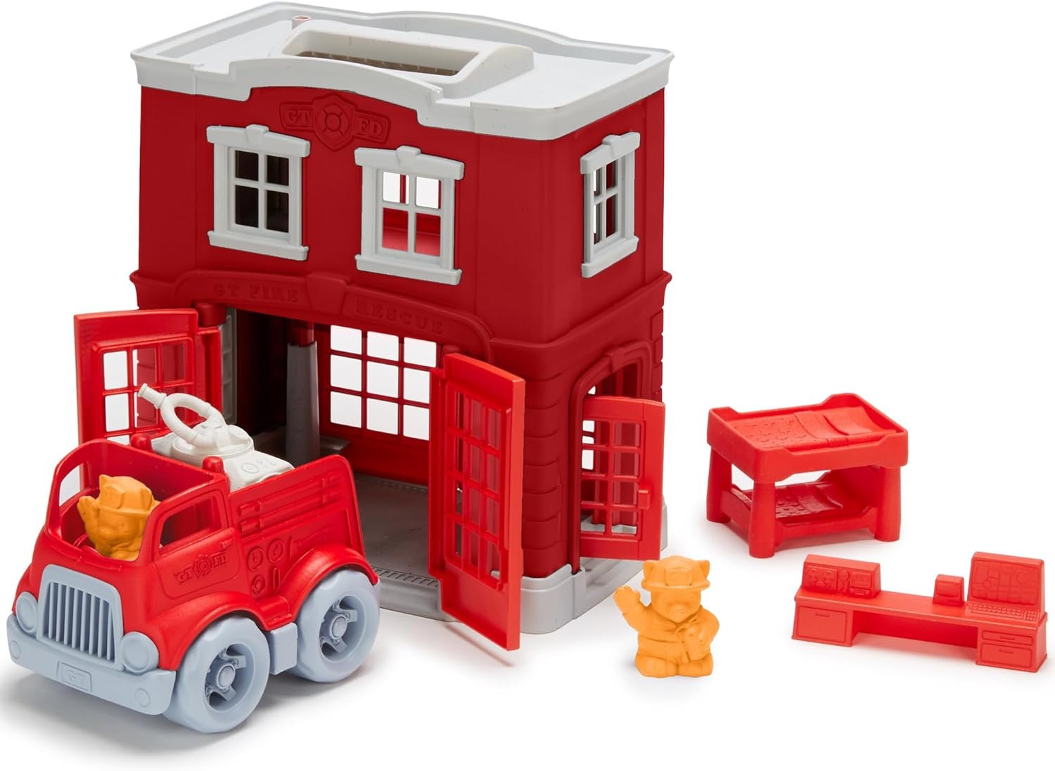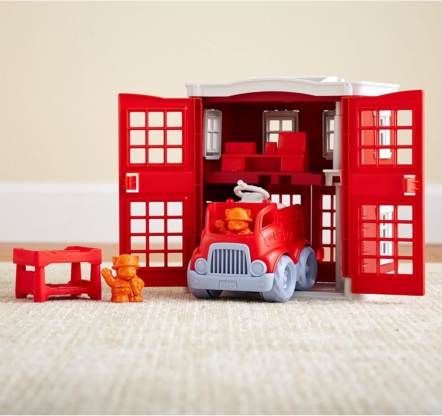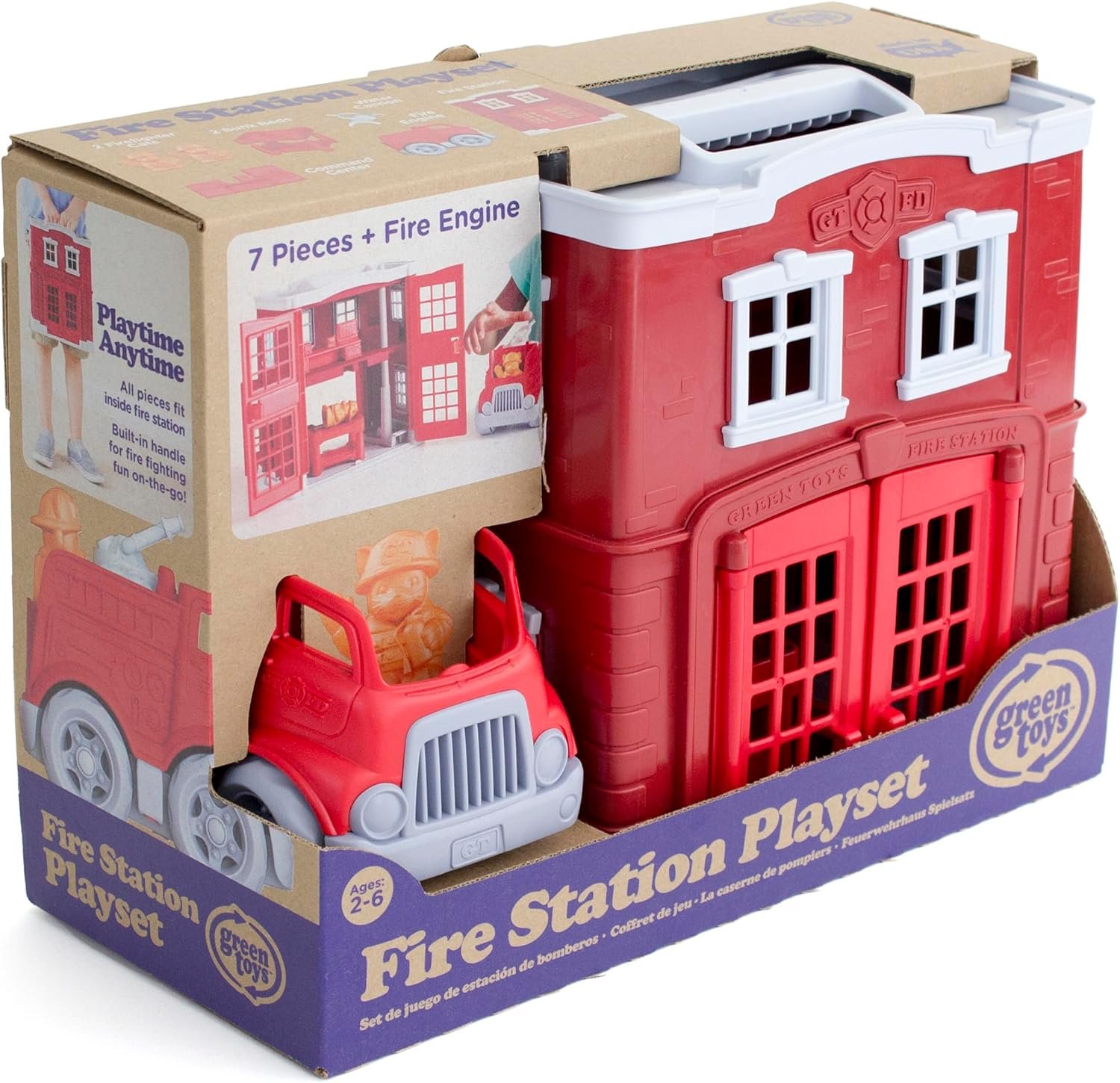 Spark imaginative play with the Green Toys Fire Station! This playset has everything your little firefighter needs to save the day, including a fire station, fire engine, firefighter cat characters, rotating water cannon, command center, and stackable bunk beds. Open and close the doors to both the front and back of the station, help the cats slide down the fire pole, and race to the rescue in the fire engine, all while helping to develop fine motor cooperative play skills. All pieces fit inside the fire station, so clean-up and storage is a breeze, and the built-in handle makes it easy to take all the fun on-the-go. Made in the USA from 100% recycled plastic with no BPA, phthalates, or PVC. Dishwasher safe. Packaged with recycled and recyclable materials printed with soy inks.