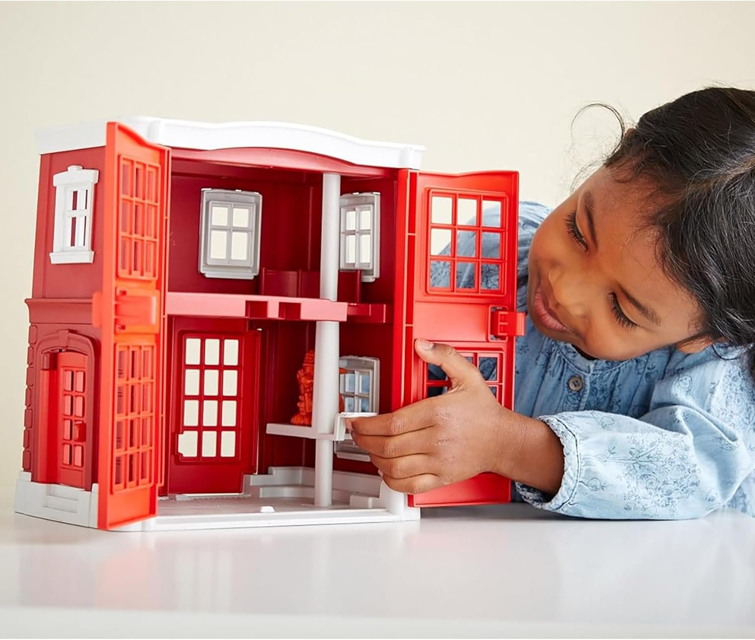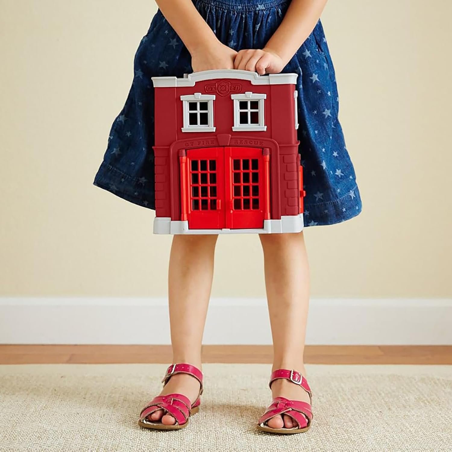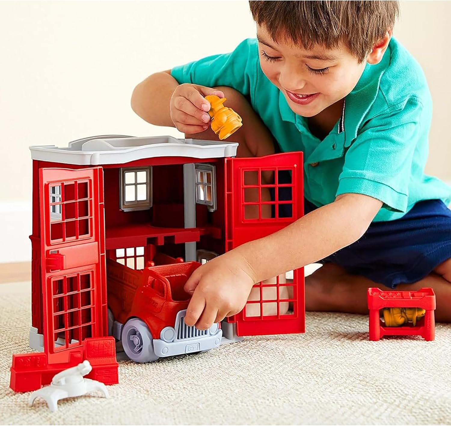 Spark imaginative play with the Green Toys Fire Station! This playset has everything your little firefighter needs to save the day, including a fire station, fire engine, firefighter cat characters, rotating water cannon, command center, and stackable bunk beds. Open and close the doors to both the front and back of the station, help the cats slide down the fire pole, and race to the rescue in the fire engine, all while helping to develop fine motor cooperative play skills. All pieces fit inside the fire station, so clean-up and storage is a breeze, and the built-in handle makes it easy to take all the fun on-the-go. Made in the USA from 100% recycled plastic with no BPA, phthalates, or PVC. Dishwasher safe. Packaged with recycled and recyclable materials printed with soy inks.