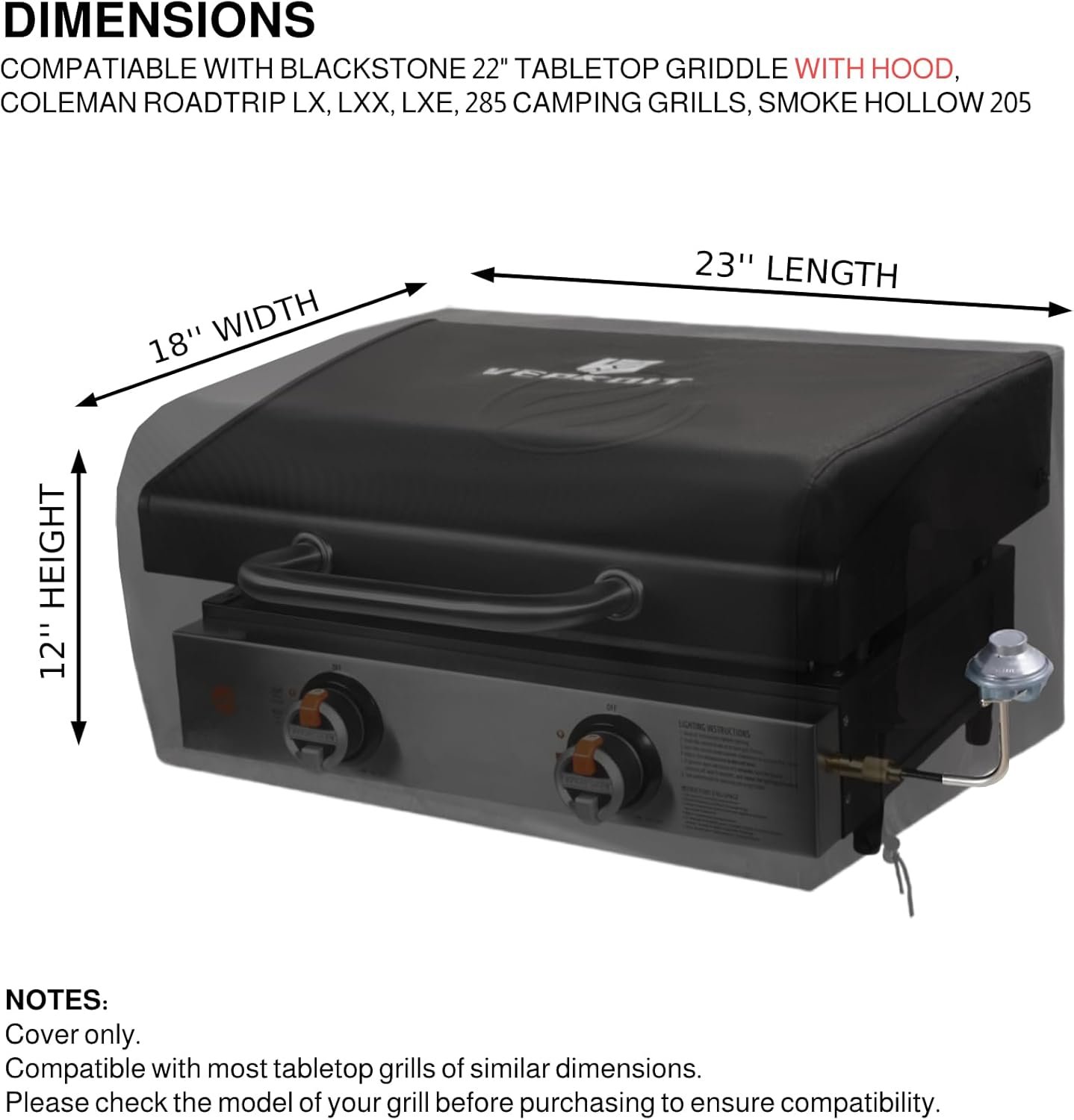 Size And Compatibility: Measuring 23″L x 18″W x 12″H, this outdoor grill cover is designed specifically for Blackstone 22″ tabletop griddle with hood. Also fit for Coleman RoadTrip LX, LXX, LXE, 285 camping grills and Smoke Hollow 205 tableTop propane gas grill, and most tabletop grills of similar dimensions. Please check the model of your grill before purchasing to ensure compatibility