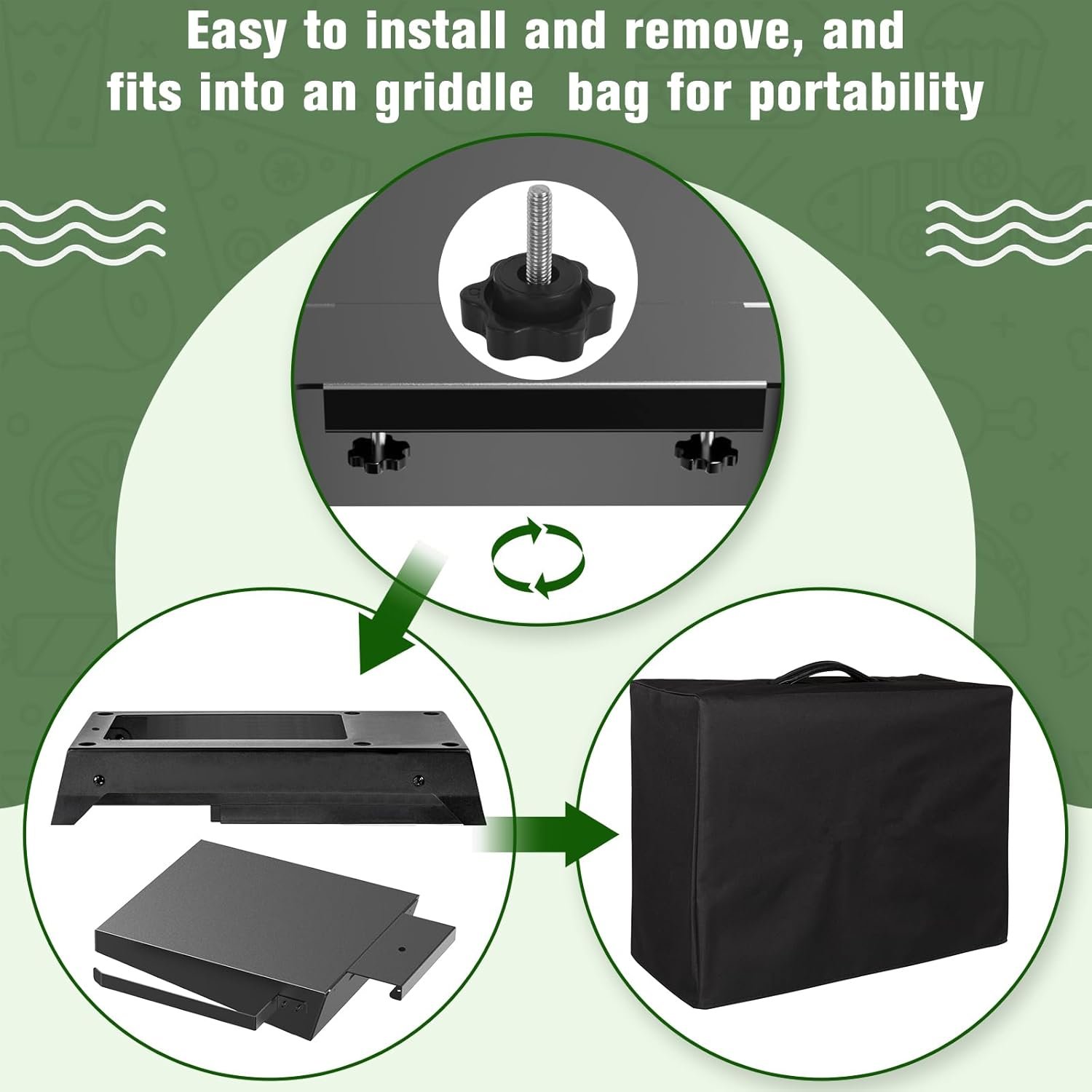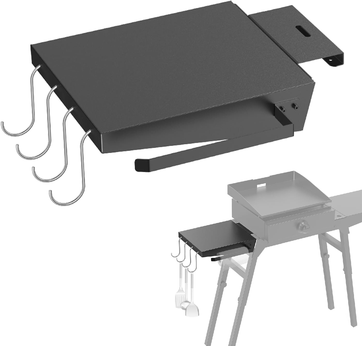 1.The side shelf provides additional storage space on your griddle stand, including utensil hooks and a paper towel holder, allowing you to store more kitchen tools, condiments, and paper towels. 2.Installing and removing this side shelf is a breeze, and it can be done quickly following the provided instructions. Furthermore, it can be conveniently placed in your purchased griddle cover, making it easy to carry and store for outdoor activities.