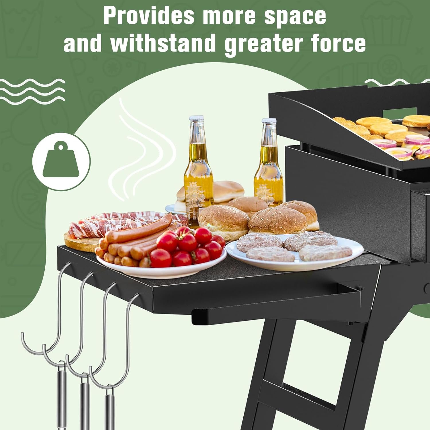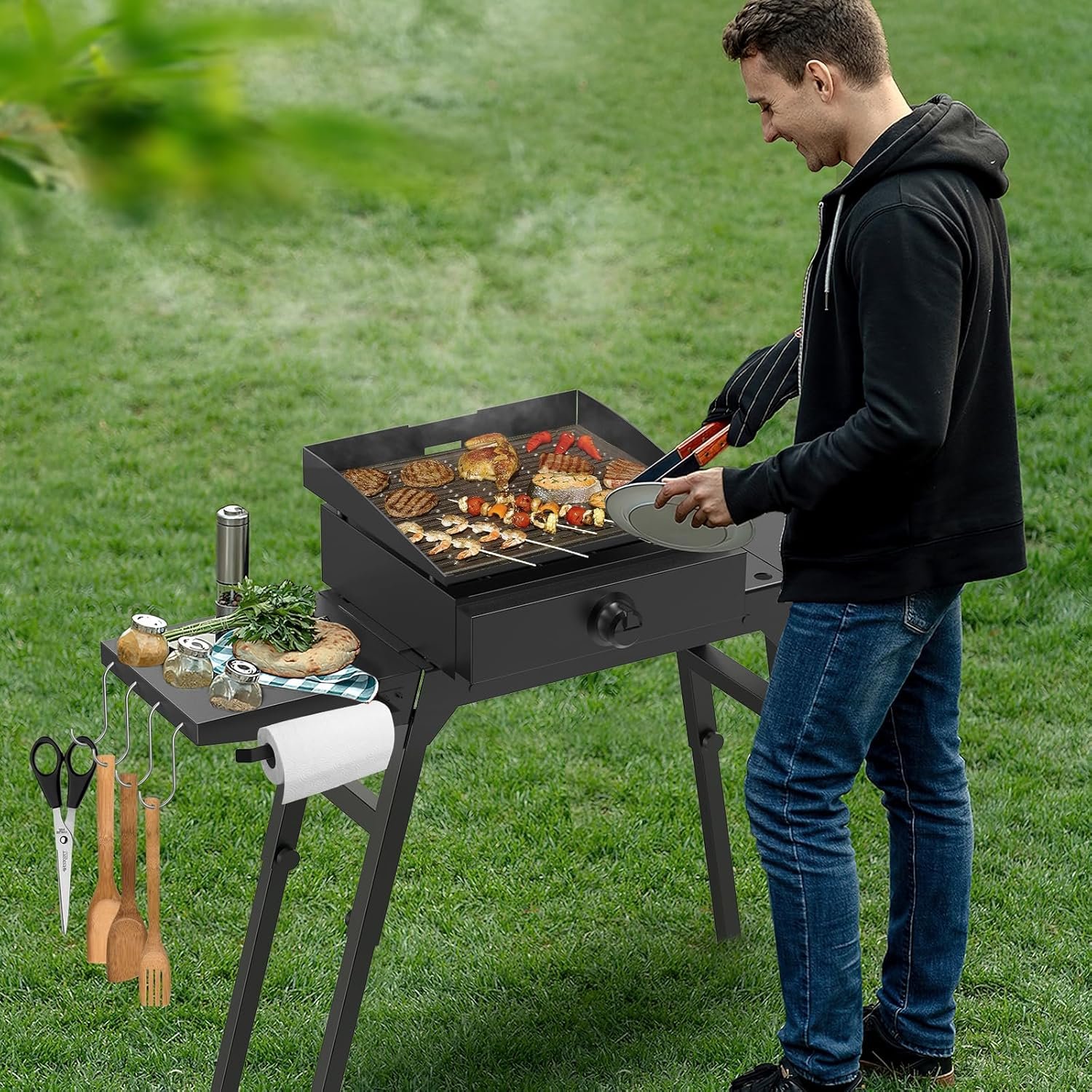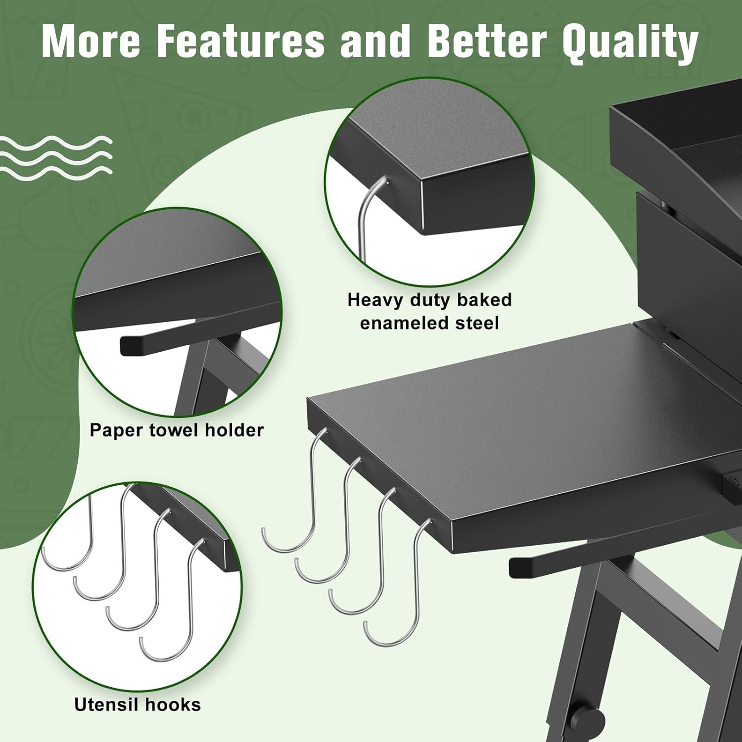 The side shelf provides additional storage space on your griddle stand, including utensil hooks and a paper towel holder, allowing you to store more kitchen tools, condiments, and paper towels. These features keep your grilling area organized and everything within easy reach.