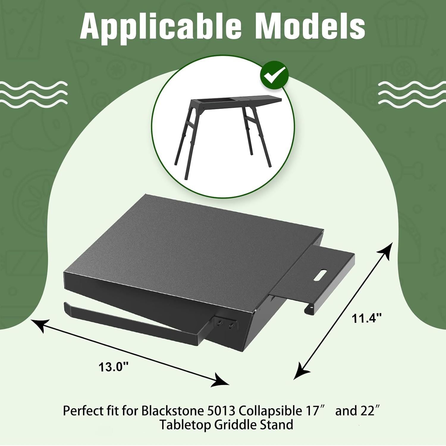 【Applicable Models】: This side shelf is only compatible with Blackstone 17-inch and 22-inch griddle stand 5013, ensuring a perfect fit; No more worries about size mismatch; simply add this side shelf, and you can better organize your grilling ingredients and tools