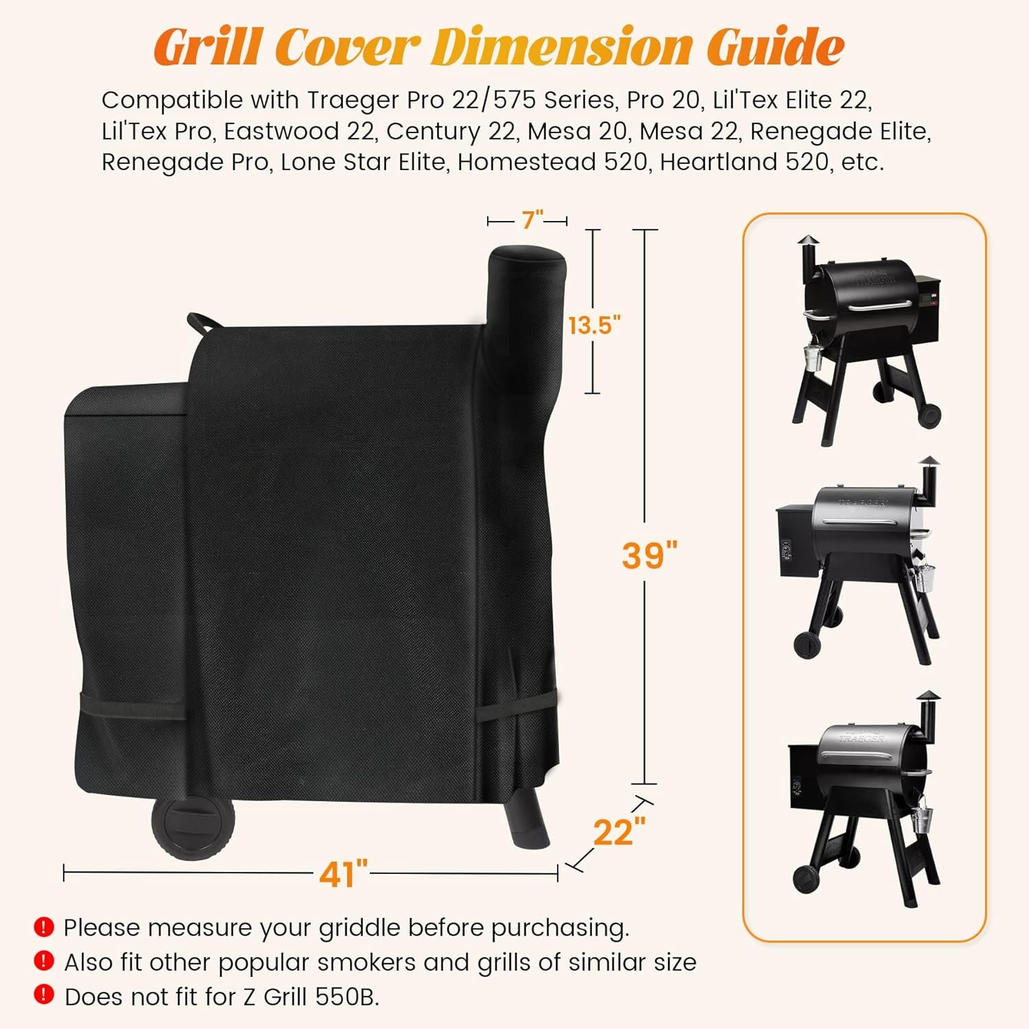 Pellet Smoker Grill Cover measured 41″ W x 22″ D x 39″H. Unidanho BAC503 smoker cover also fit for Traeger Century 22, Lil’Tex Elite 22, Lil’Tex Pro, Eastwood 22, Mesa 20, Mesa 22, Renegade Elite, Renegade Pro, Lone Star Elite, Homestead 520, Heartland 520, and more grill. Please double-check the grill cover size before ordering.
