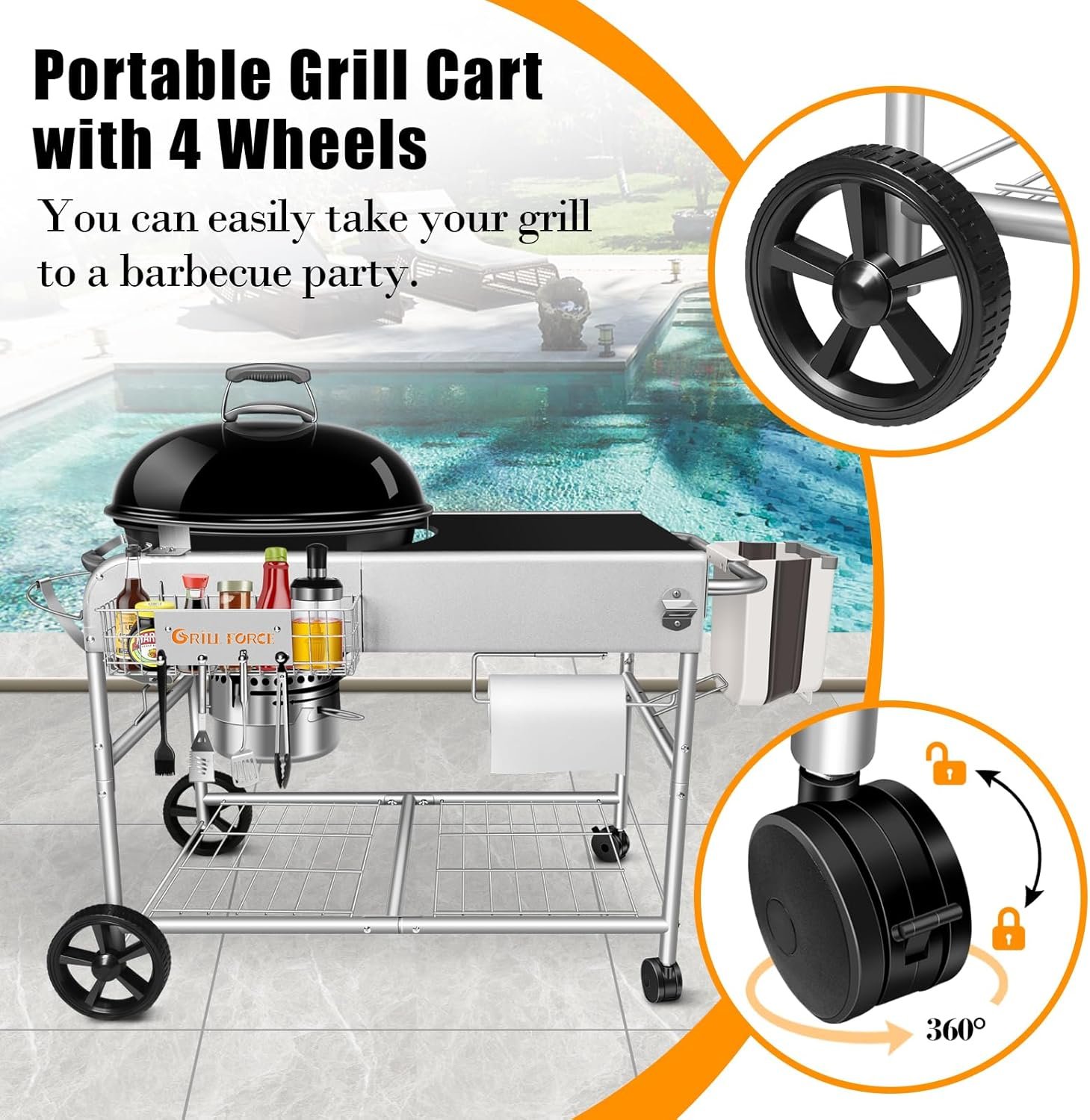 【Slide-A-Side Lid Holder for Convenience】No more searching for a spot to place your grill lid while cooking! Our grill cart for Weber kettle features a built-in slide-a-side lid holder, providing a practical solution to keep your lid safely out of the way. This essential accessory allows you to free your hands while grilling, preventing accidental drops and dents, keeping your food clean, and even helping to save charcoal by blocking the wind.