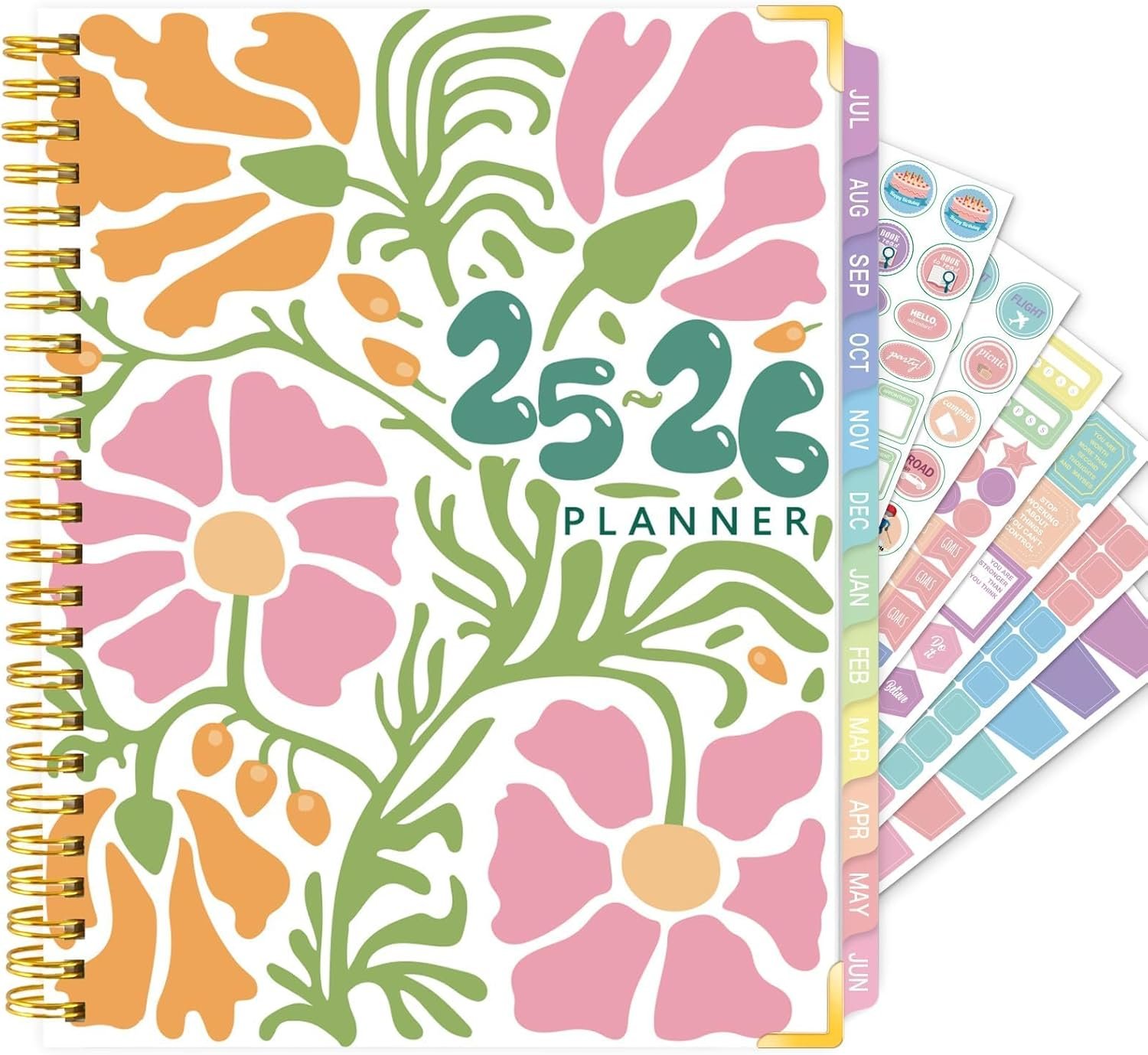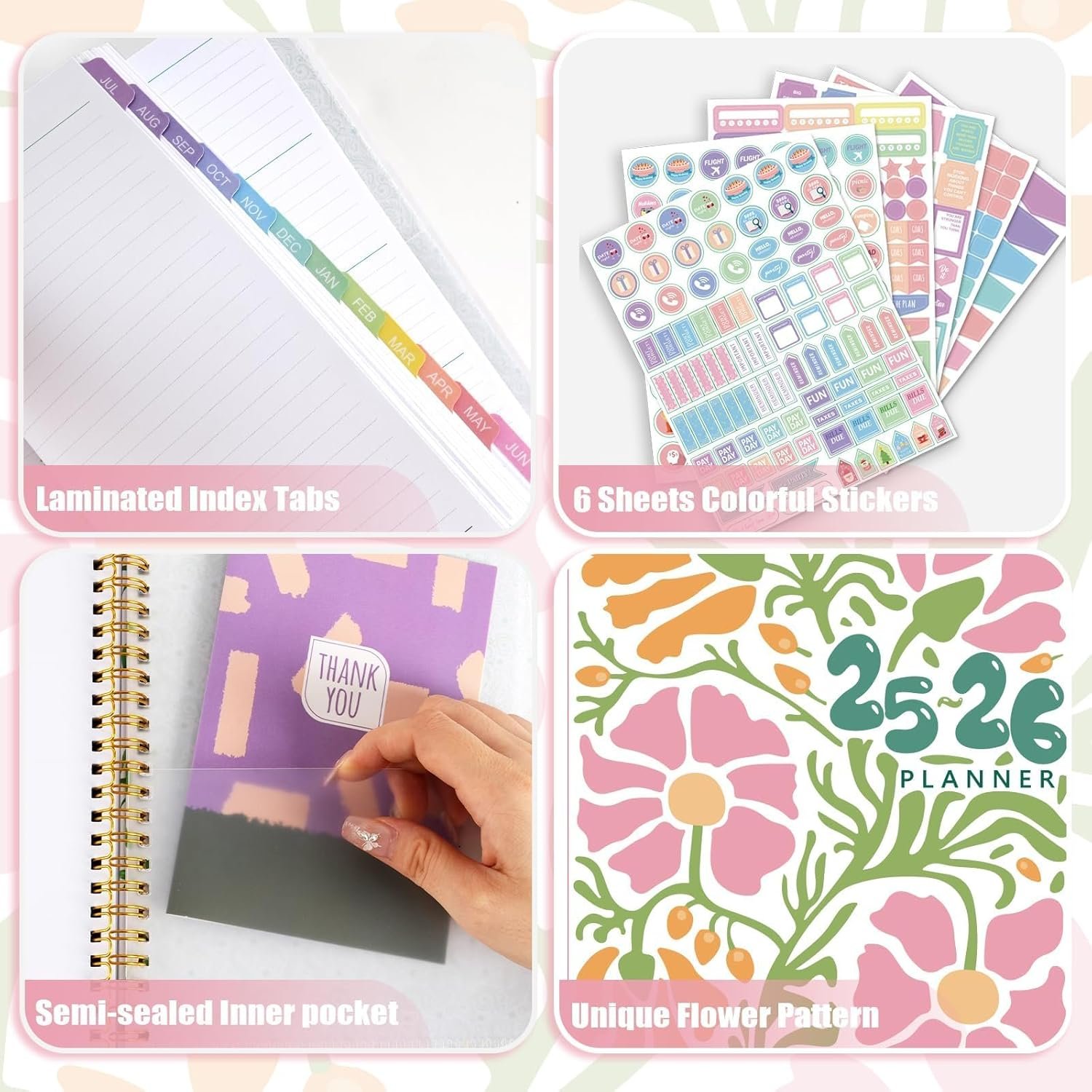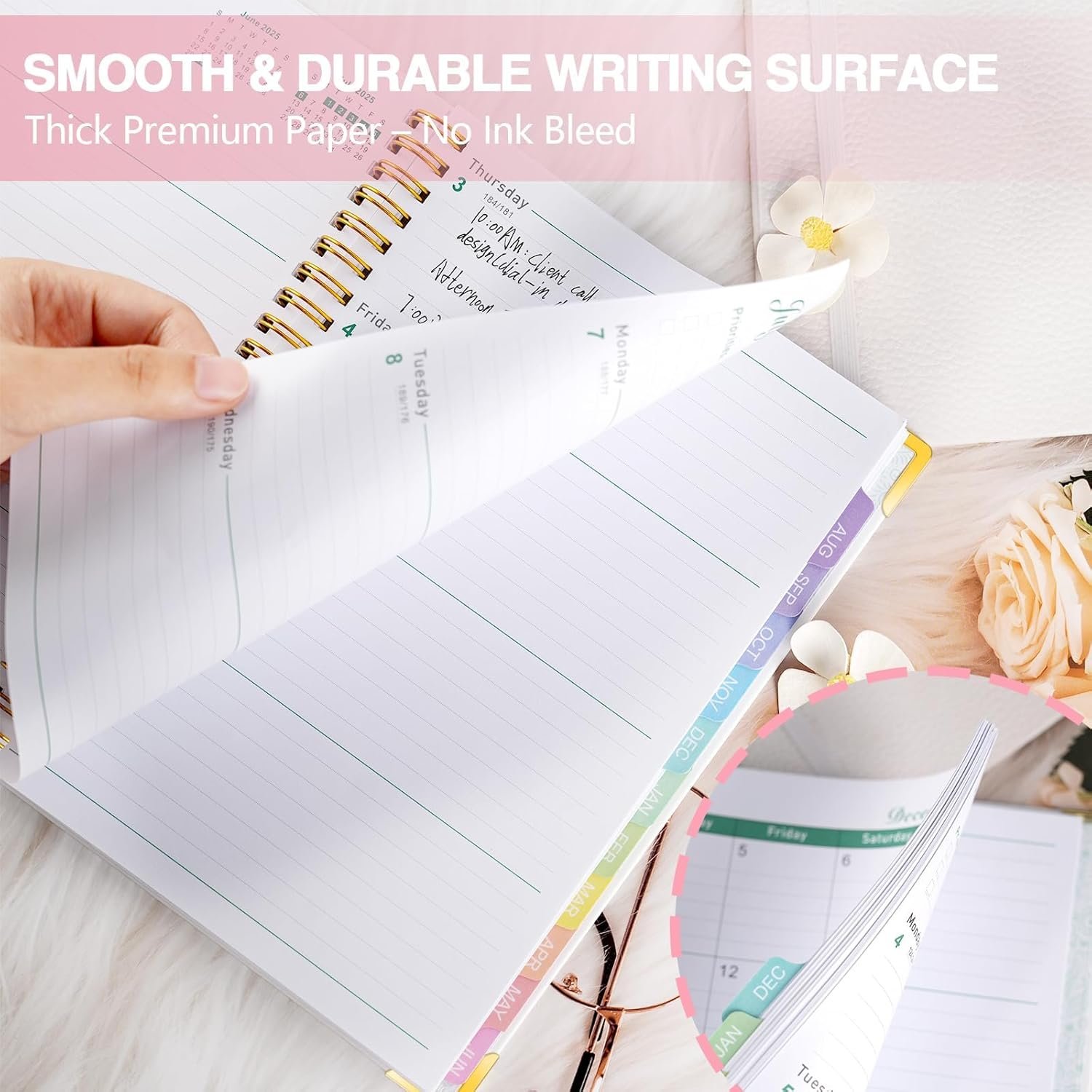 Smart & Stylish Design: Designed for daily use, our 2025 planner weekly and monthly features laminated index tabs for quick flipping, a thick cover with metal corners for extra durability, and a transparent inner pocket for loose papers. With 6 sheets of 300+ colorful planner stickers, and a twin-wire binding that lays flat—this agenda organizer book planner is both fun and functional