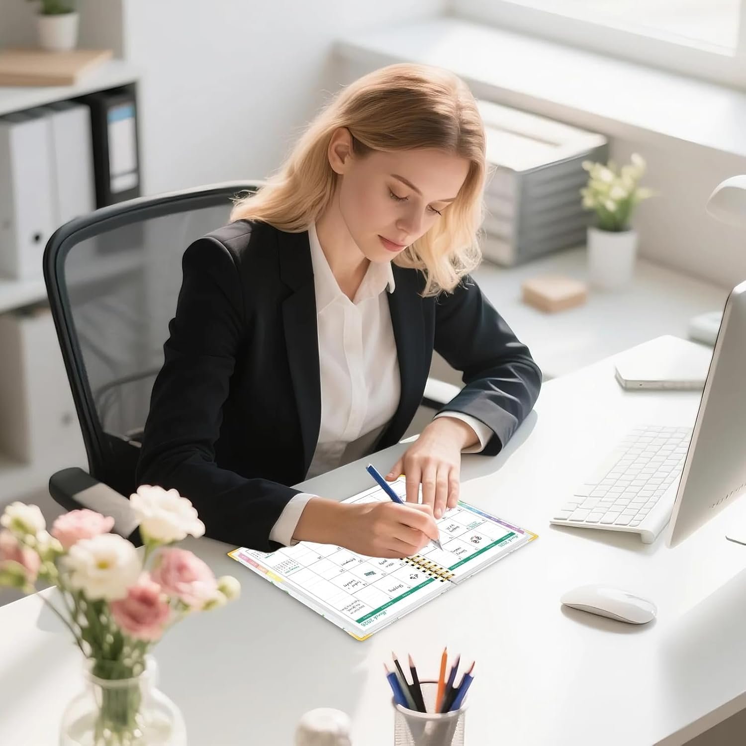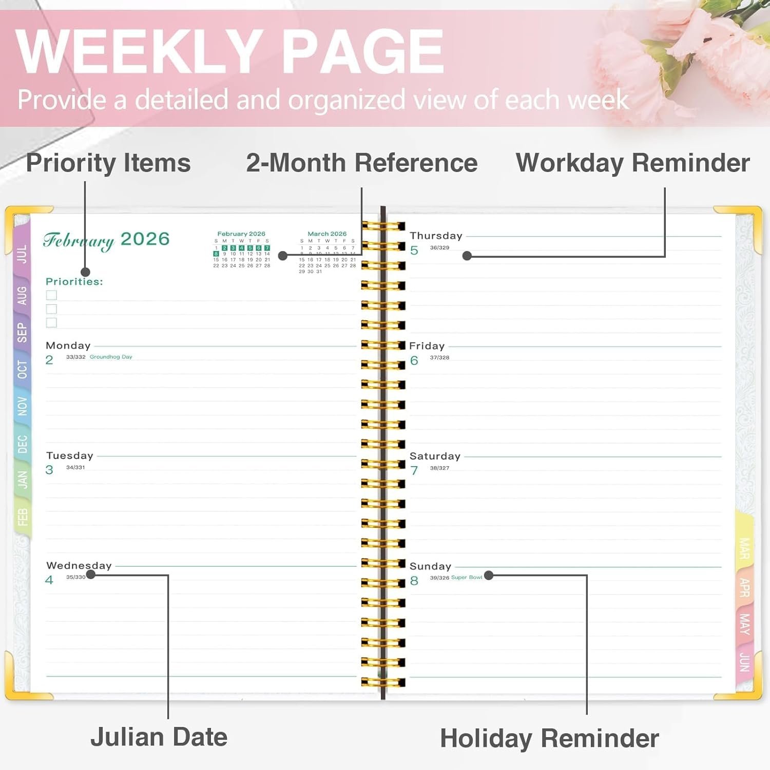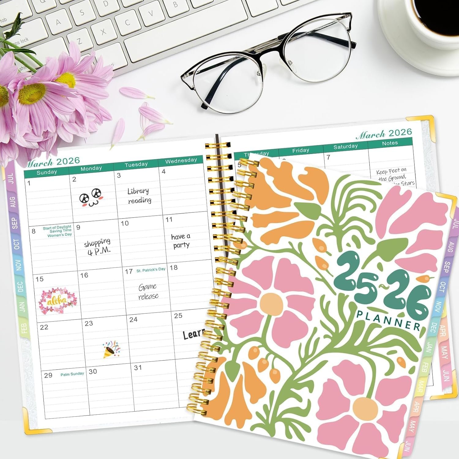 Smart & Stylish Design: Designed for daily use, our 2025 planner weekly and monthly features laminated index tabs for quick flipping, a thick cover with metal corners for extra durability, and a transparent inner pocket for loose papers. With 6 sheets of 300+ colorful planner stickers, and a twin-wire binding that lays flat—this agenda organizer book planner is both fun and functional