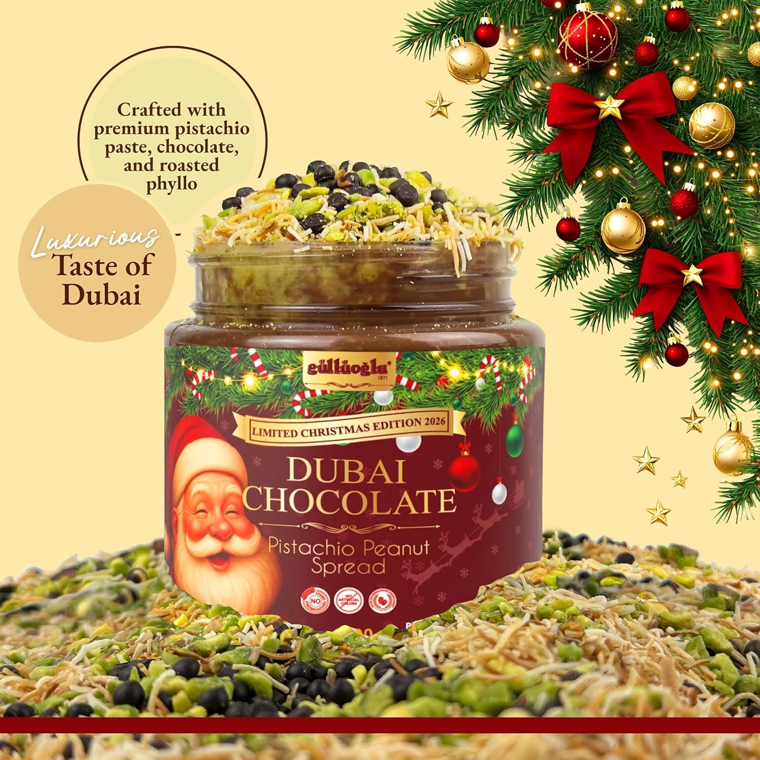 🔸 Perfect Gift from the Heart of Dubai – Share the Taste of Tradition Whether as a gift for chocolate lovers or a treat for yourself, this product captures the elegance and sophistication of Dubai’s renowned sweets culture. With its rich flavor, striking packaging, and heritage-driven recipe, Gulluoglu Dubai Chocolate Pistachio Peanut Spread is more than a spread – it’s a journey to the heart of Arabian indulgence.