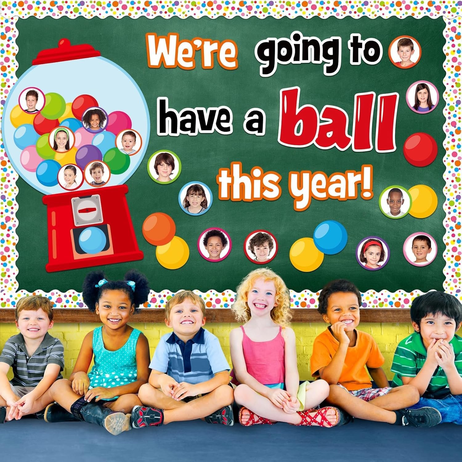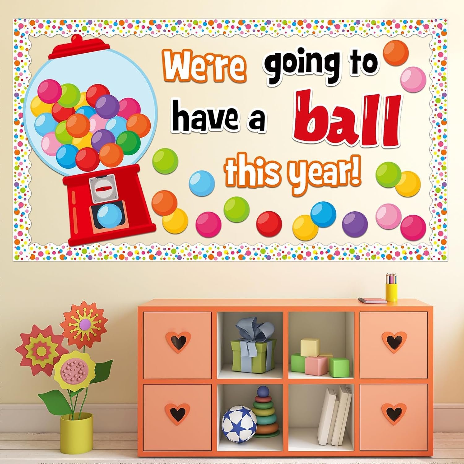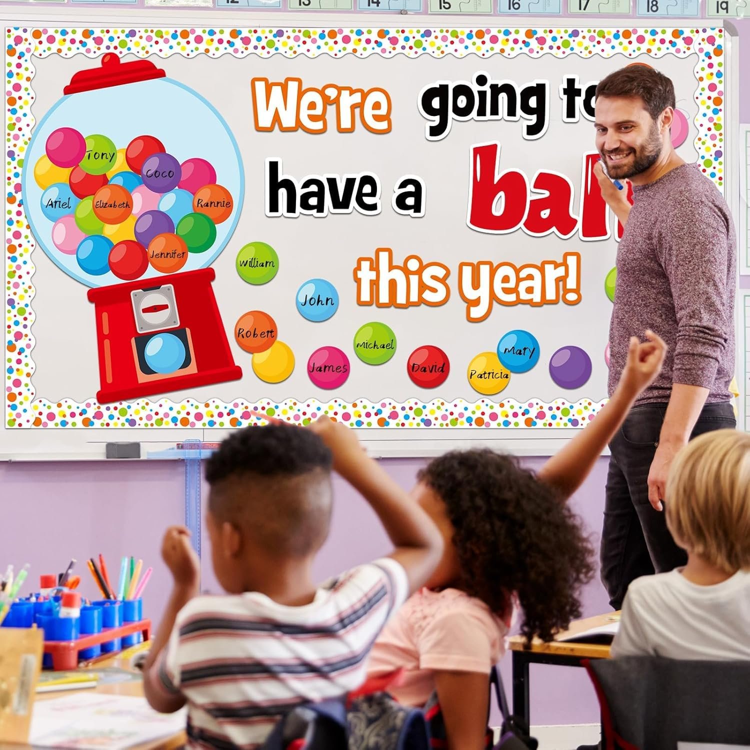 Package includes: You’ll get 1 set of gumball machine bulletin board cutouts decorations(cross-cut into 6 pieces), 30pcs of “We’re Going To Have A Ball This Year” cutouts, 16pcs of bulletin board, 40pcs of colorful gumball cutouts, and enough adhesive dots, making it an eye-catching and lively addition to your classroom.