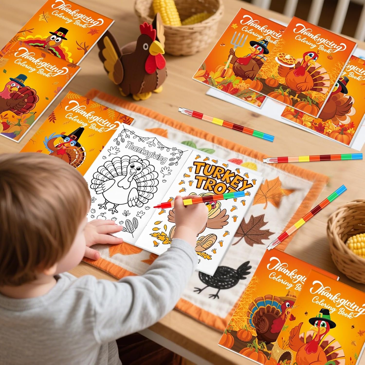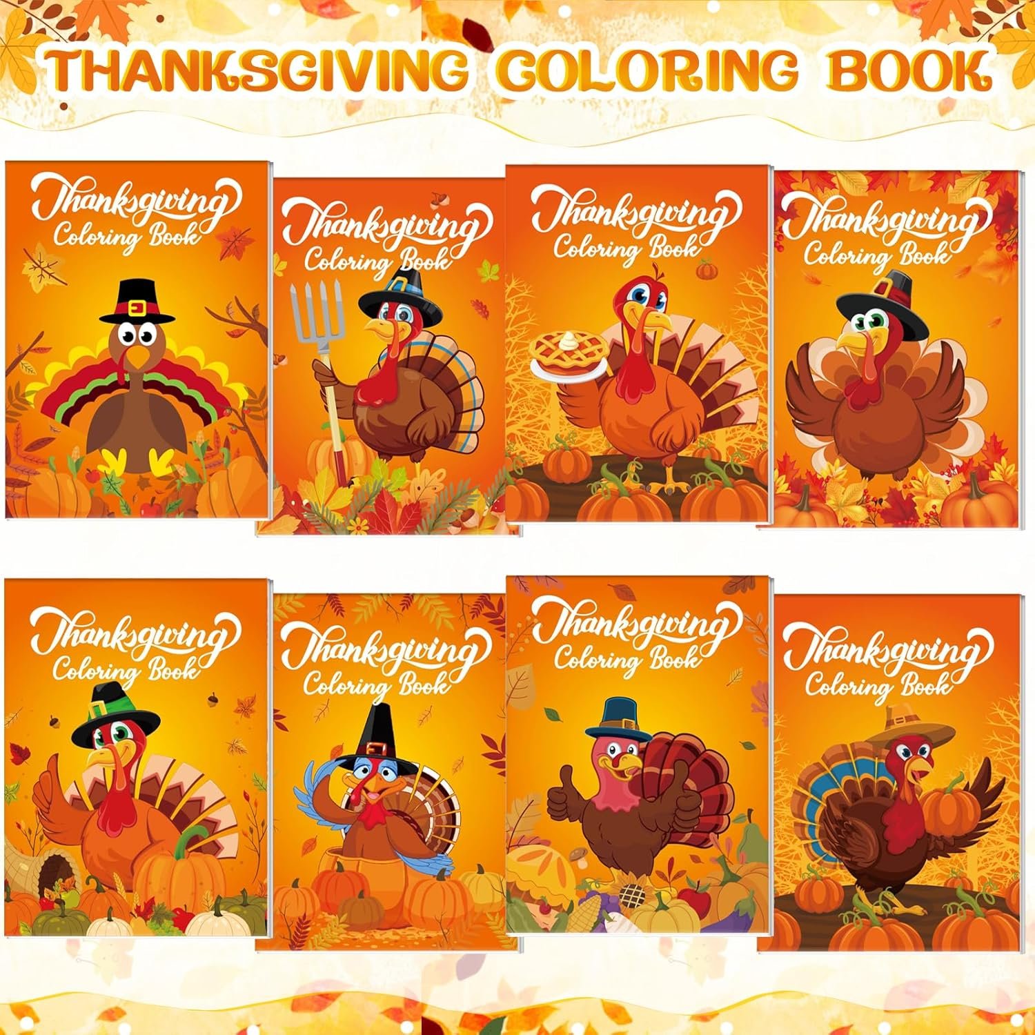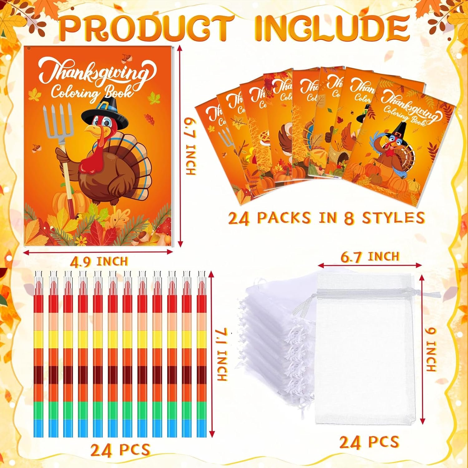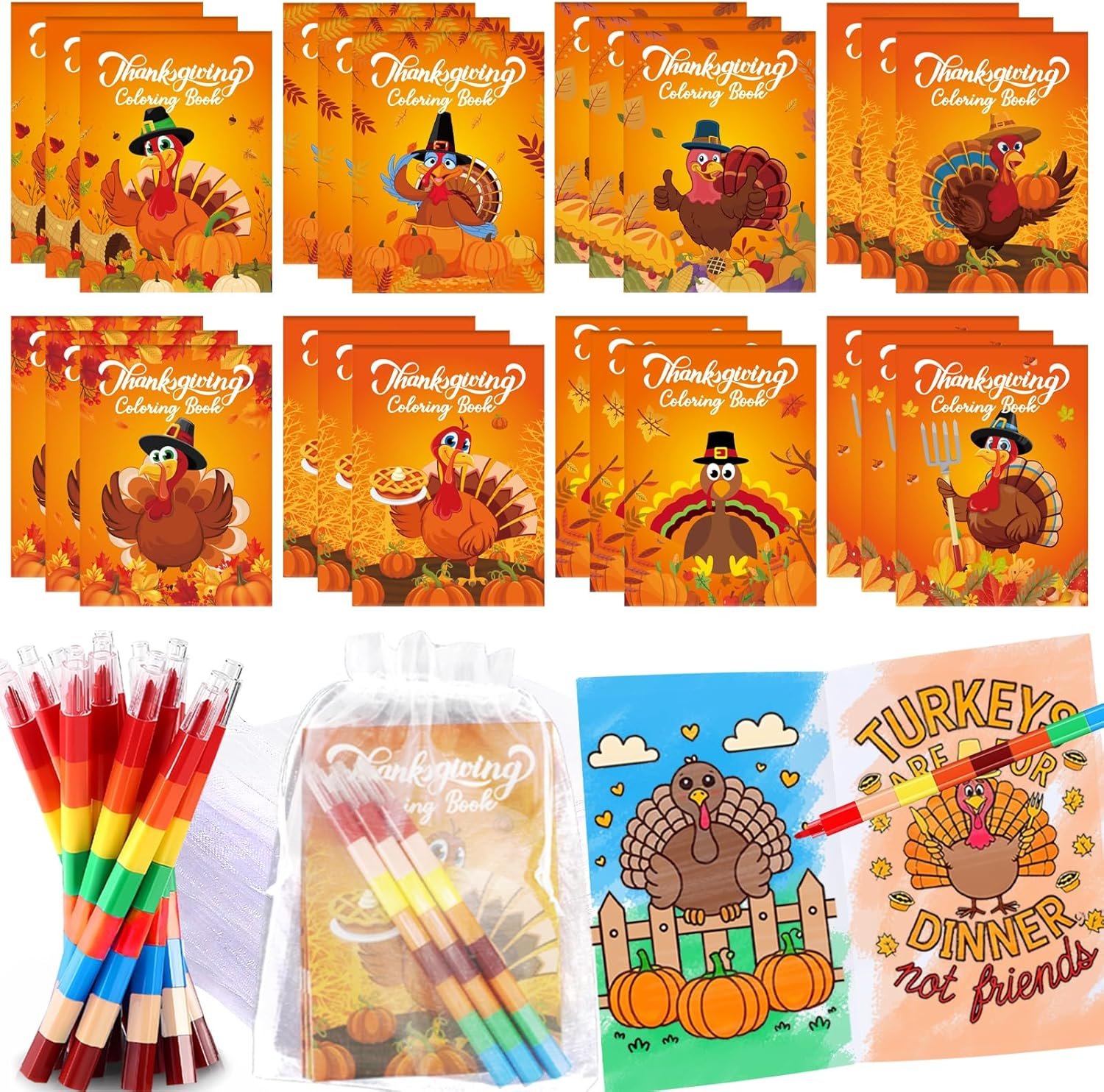 Package Contents: The Thanksgiving coloring book set includes 24 mini coloring books with 8 different Thanksgiving turkey fall cover designs, 3 books for each cover design. Each fall Thanksgiving coloring book contains 12 double-sided coloring pages,24 coloring pencils and 24 organza bags