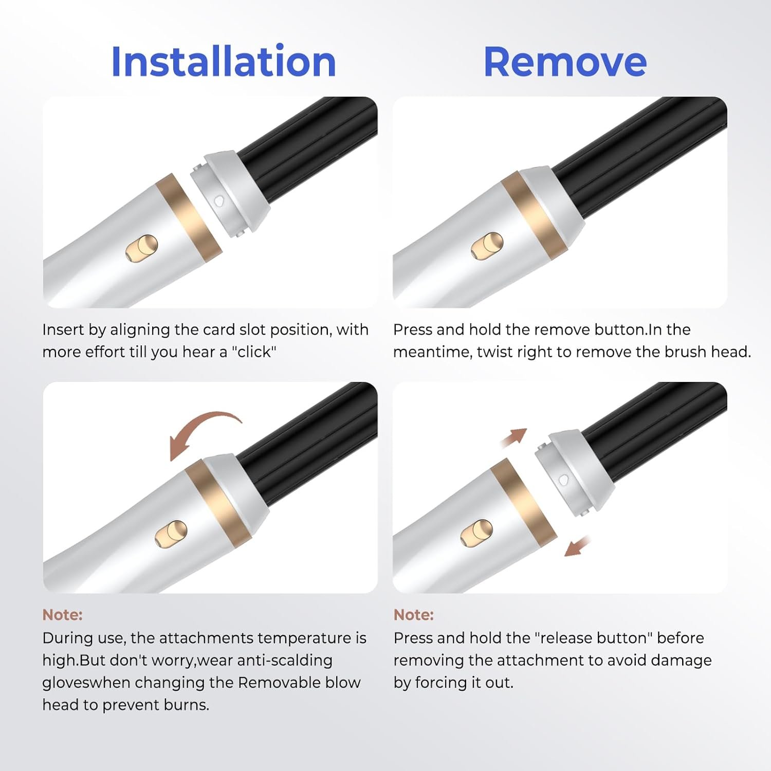 Safety Air Curler:Our hot air brush styler and dryer plug have standard US ALCI Safety Plug Auto Leakage Protection. During use auto wrap curler, the handle temperature is high, please don’t worry, we have undergone numerous high-temperature experiments and have safety and explosion-proof properties. At the same time, Wear anti-scalding gloves when changing the air curler removable blow head to prevent burns.