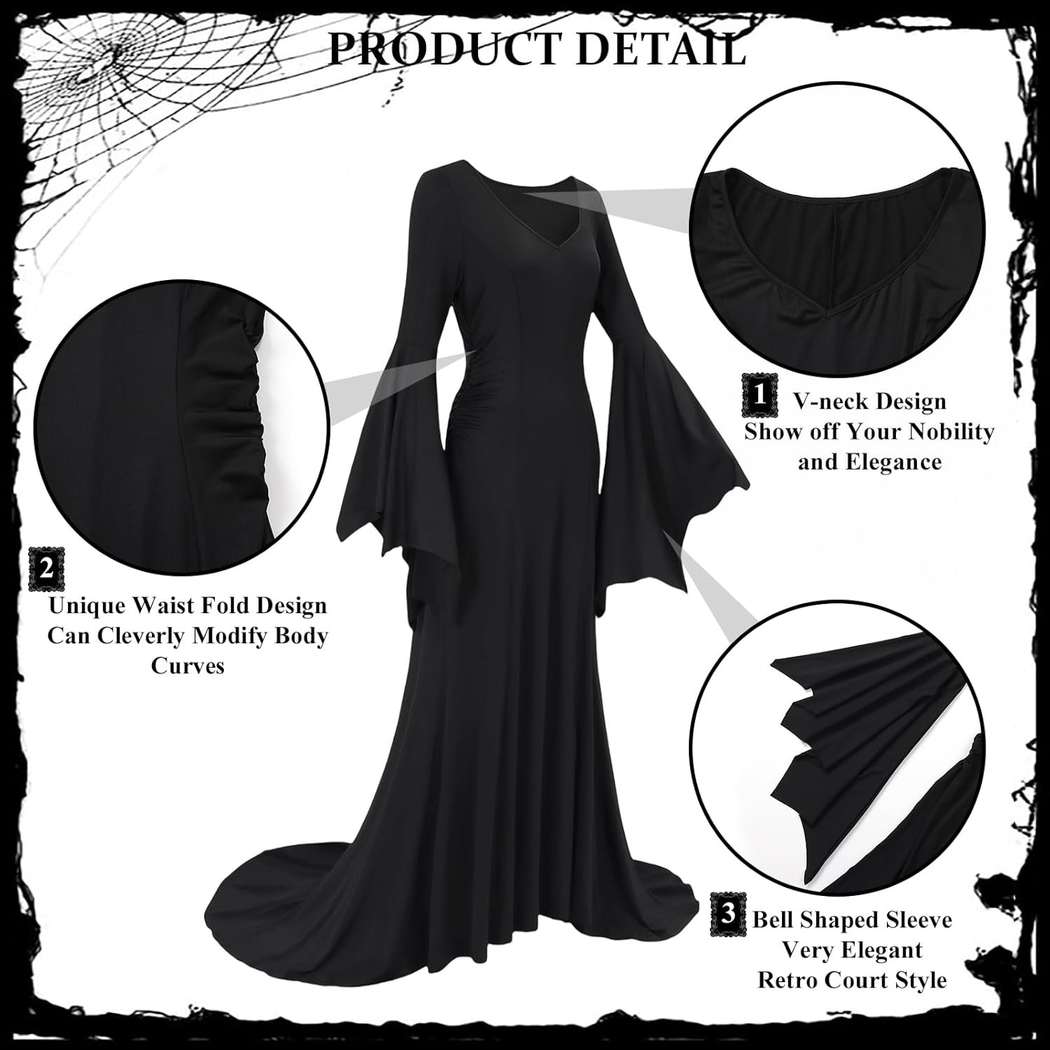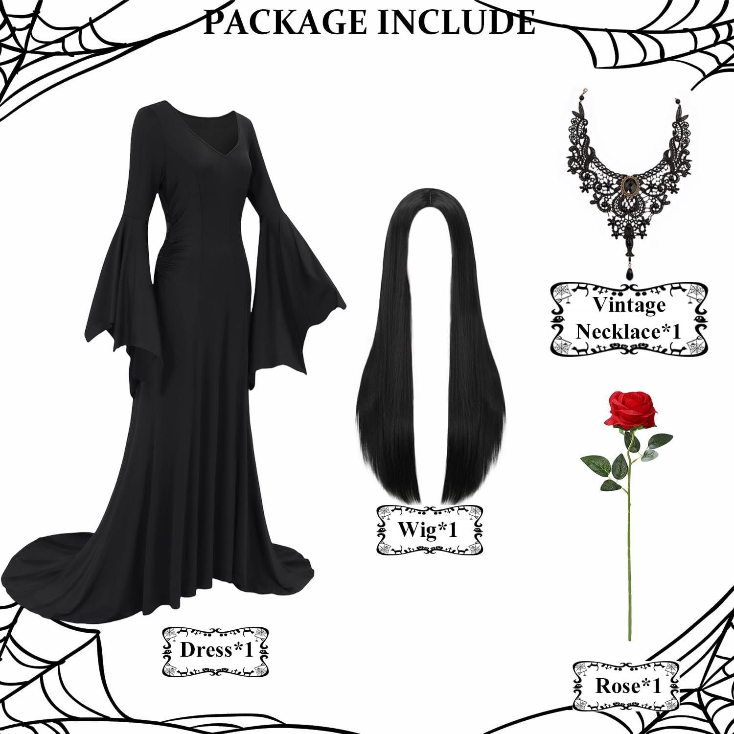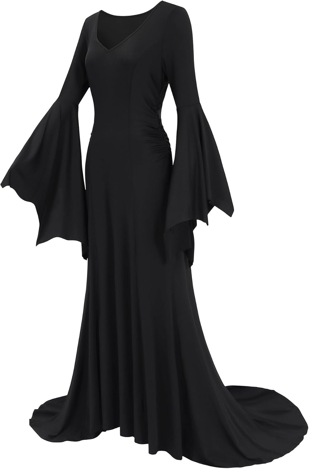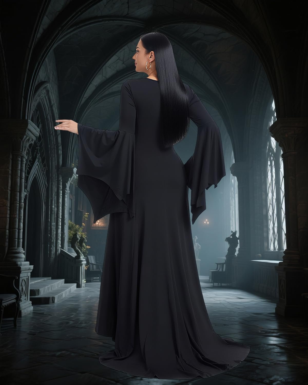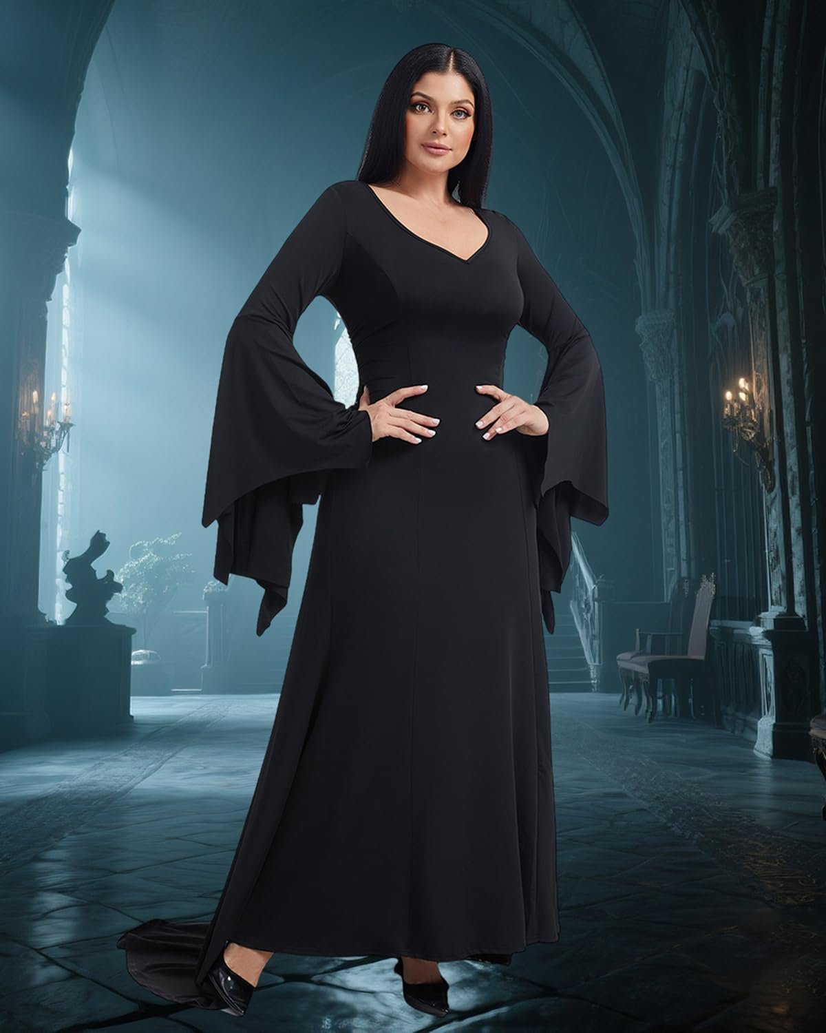 Customers find the Morticia Addams costume flattering, with one noting it looks just like the character’s appearance. The medium size fits great and is just the right length, while being comfortable and stretchy. They appreciate its quality, fun-to-wear nature, and non-transparent design.