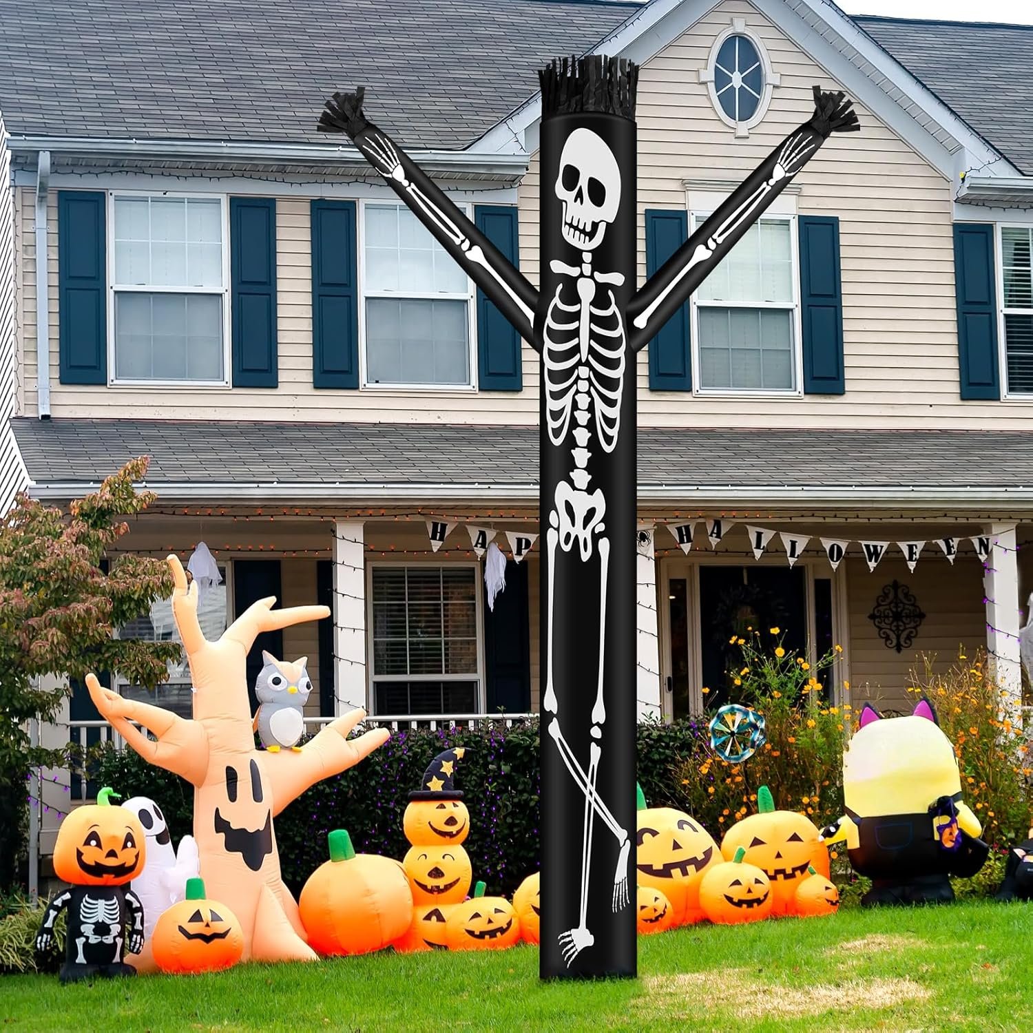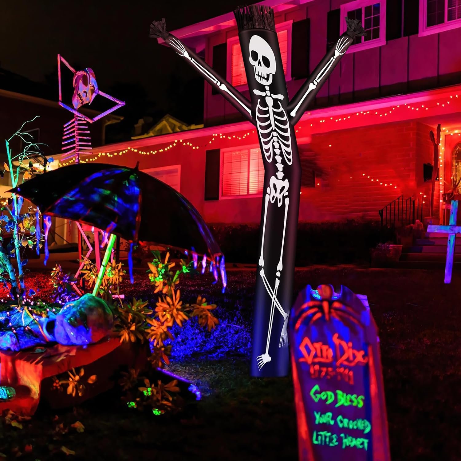 Material Description: made from a quality, reliable fabric, our black Halloween wacky inflatable skeleton tube guy is built to last; It resists tearing and withstands outdoor conditions, ensuring long-term use without damage-ready to celebrate many Halloween seasons with you